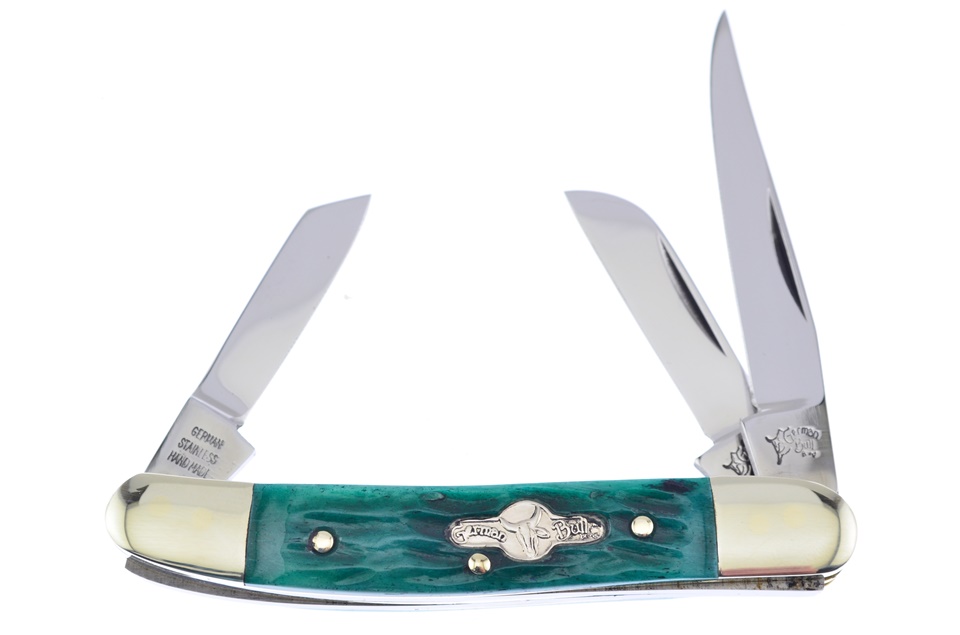 This 3 1/4" Green Picked Bone Stockman by German Bull is a great choice for any collector. This item is going to sell like hotcakes, so get yours now.