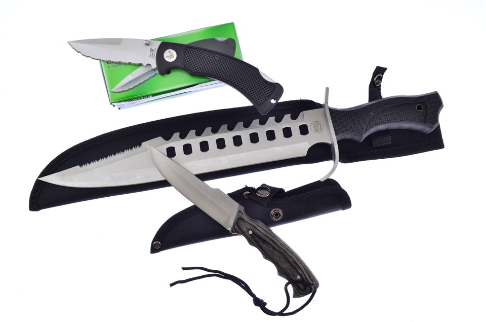 This set is a great addition to any collection. You'll get five of the 5" Black Rubber Tactical Folders, one of the 9" Silver Wood Bowies, featuring Stainless Steel Pins, one of the 16" Black Rubber Bowies, featuring Vented Blade. You won't find a lower price anywhere!