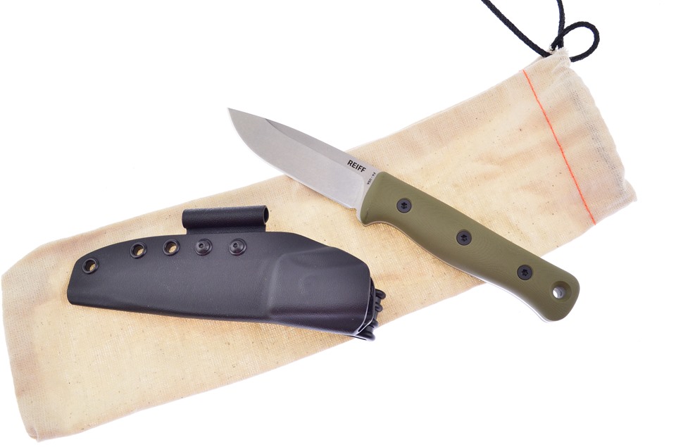 The Reiff F4 is a general purpose bushcraft style survival knife. Its 4" blade is robust enough to withstand the toughest survival situations, yet refined enough to breeze through any bushcraft task. Constructed from 5/32" thick CPM®3V high-alloy steel, these knives are exceptionally durable. The spine will rain sparks from a ferro rod or scrape cedar bark for tinder. The sturdy full tang is skeletonized to reduce the overall weight of the knife, making the F4 an ideal carry companion in the field or around town. You'll find the ergonomic 5" handle has no hotspots, providing a seamless interface between your hand and the tool. Whether you're crafting a bow drill or field dressing an elk, the F4 will get the job done right.