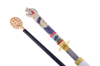 The tsuba, fuchi and kashira fittings are of iron with detailing picked out in silver and brass. The wood tsuka grip is fitted with inlaid panels of rayskin and it is bound in knotted cotton tsuka ito cord with menuki wrapped within the grip wrap.