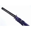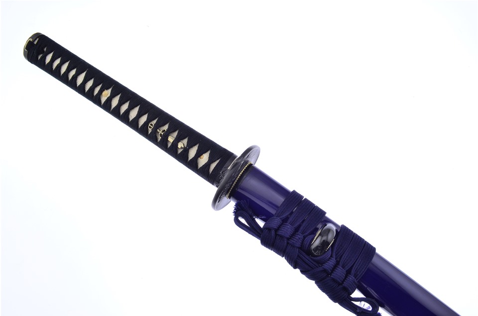 The scabbard is crafted from wood with buffalo horn fittings and is finished with a lacquered coat that is midnight blue in hue; the saya is finished with a knotted sageo cord. The sword comes with a cloth sword bag.
