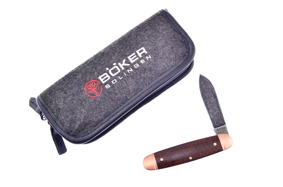 The Boker Copper Burlap Micarta Series freatures acid-washed 01 tool steel with nail nicks. The handles are pressed burlap micarta with copper pins, liners, and bolsters. This uniquie single-blade Jack features a 2.5" spear-point blade. 3.75" closed. 2.4oz. Made in Solingen, Germany. Comes with an embroidered zip storage case.