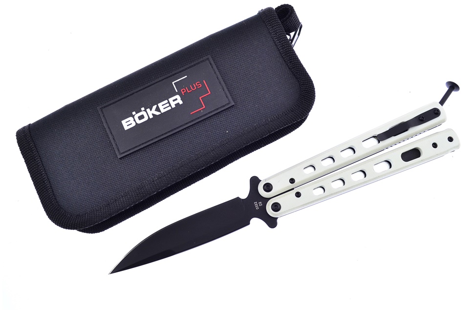 The Boker Stormtrooper Balisong features a 3.5" black coated D2 tool steel spear point blade with imposing Empire White G-10 handles and black coated stainless steel accents. This fearsome flipper has premium upgrades like zen pins, weight-reducing handle cutouts, a spring-loaded latch lock, and a removeable stainless steel pocket clip. It's 5.12" closed and weighs 5.01oz. Includes a high-quality zippered nylon storage pouch.