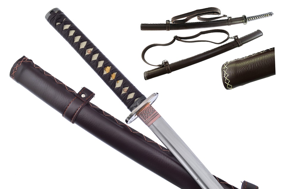 Hand honed razer sharp Japanese katana. The blade is forged from 1045 high carbon steel and tempered for consistent hardness and flexibility. The tsuba (hand gurad) features Heron, a beautify and elegant bird, which is a symbol of peace in Japan. Overall: 41 , Blade: 27 1/2 , Handle: 10 1/2. Features a wooden scabbard (saya) wrapped by stiched brown leatherette. Adjustable and removable shoulder straps. Including black cotton sword bag for carrying and protection. Double pegged (two Mekugi / Pegs) full tang blade. Black leatherette wrapped handle.. Stock is limited, so add to your cart before they are all gone.