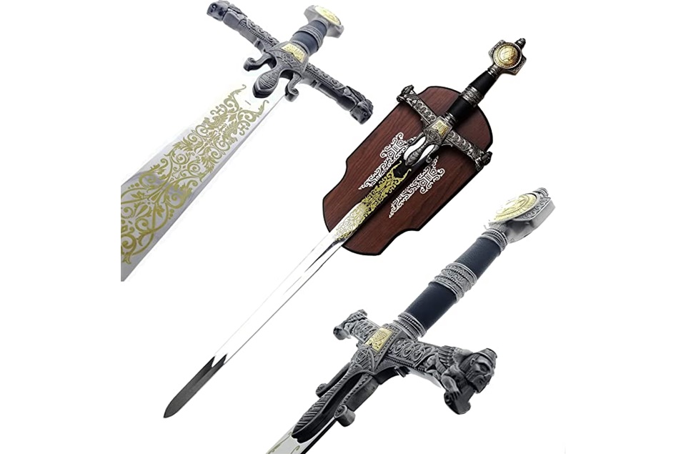 King Solomon was the builder of the First Temple in Jerusalem, and he is a symbol of great wisdom, wealth, and power, but ultimately as a king whose sin, including idolatry and turning away from Yahweh, leads to the kingdom being torn in two during the reign of his son Rehoboam. King Solomon is the subject of many other later references and legends. This sword features a blade that is polished 440 stainless steel with a dulled edge and sharp point. A long ricasso runs up from the base of the blade, painted on the ricasso is complex scroll work of leaves and vines. A long languet runs down the ricasso with a detailed pattern. The ends of the quillons are Persian Sphinxes wearing a kippah on their heads. In the middle of the cross guard is the Star of David underneath a Menorah. The guard and pommel are in gold color. The handle is ornate steel scroll work with black imitation leather. The pommel of the sword is solid steel with a large Star of David in gold finish.