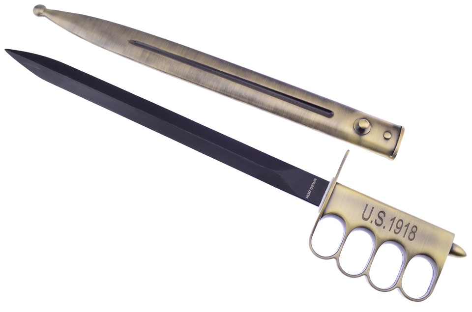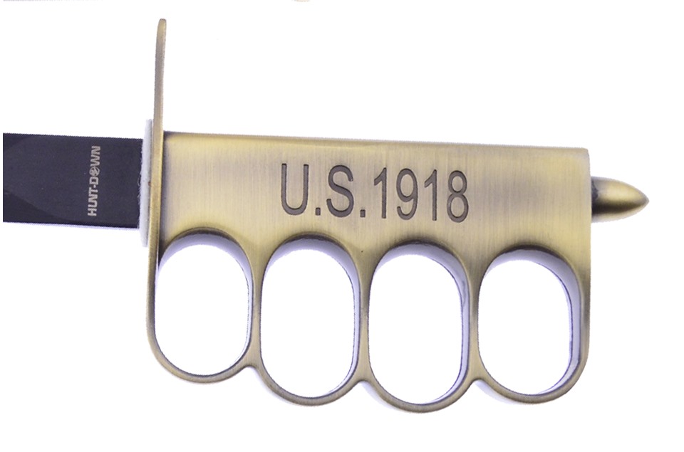 The U.S. Model 1918 Trench Knife Short Sword was the second major “Knuckle Knife” to be officially adopted and issued to the US military. It was developed for use in the horrific trench warfare that typified the stalemate on the Western Front during the latter part of World War One and saw use not only there, but during World War Two as well. A modern reproduction of the famous US 1918 Military Brass Short Trench Sword from World War One but with traditional double edge blade.
