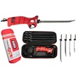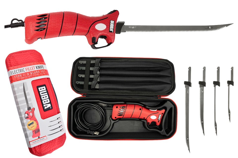 Designed by fishermen for fishermen and ergonomically crafted to fit perfectly in your hand, this knife is a game-changer. We?ve stayed true to our roots by incorporating the iconic, non-slip grip handle so you can keep a firm grasp on the blade while turning your latest catch into your next meal. The engineered ventilation is made to maximize motor transmission output; giving you an incredible amount of torque. Included are four different blade styles ? 7? E-FLEX, 9? E-FLEX, 9? E-STIFF, and 12? E-STIFF ? reflecting our legendary Tapered Flex and Stiff fillet knives. These blades are constructed from high carbon stainless steel and coated with titanium nitride for corrosion resistance. It features an eight-foot cord, safety lock and trigger guard for ultimate security. We?ve also included a premium EVA molded carrying case, which allows you to break apart the storage units for easy cleaning. This knife will have you stacking fillets until you?re out of fish.
