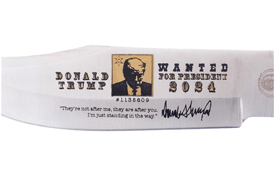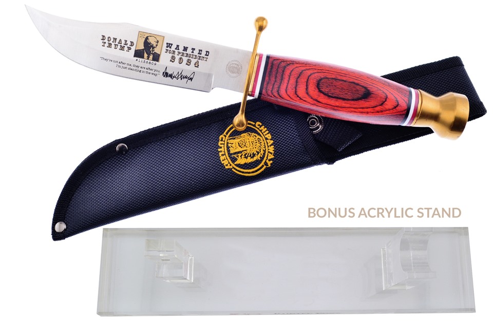 Introducing the must-have collector's item for true patriots and enthusiasts alike: the Donald Trump "Wanted" Bowie knife. Crafted with precision and adorned with President Trump's iconic image, signature, and his resounding quote, "They're not after me, they are after you. I'm just standing in the way," this knife is a symbol of strength, resilience, and unwavering conviction. Whether displayed proudly in your home or wielded with pride, this limited-edition piece comes complete with an acrylic display stand, making it the ultimate centerpiece for any Trump supporter's collection. Embrace the legacy, defend your values, and own a piece of history with the Donald Trump "Wanted" Bowie knife.