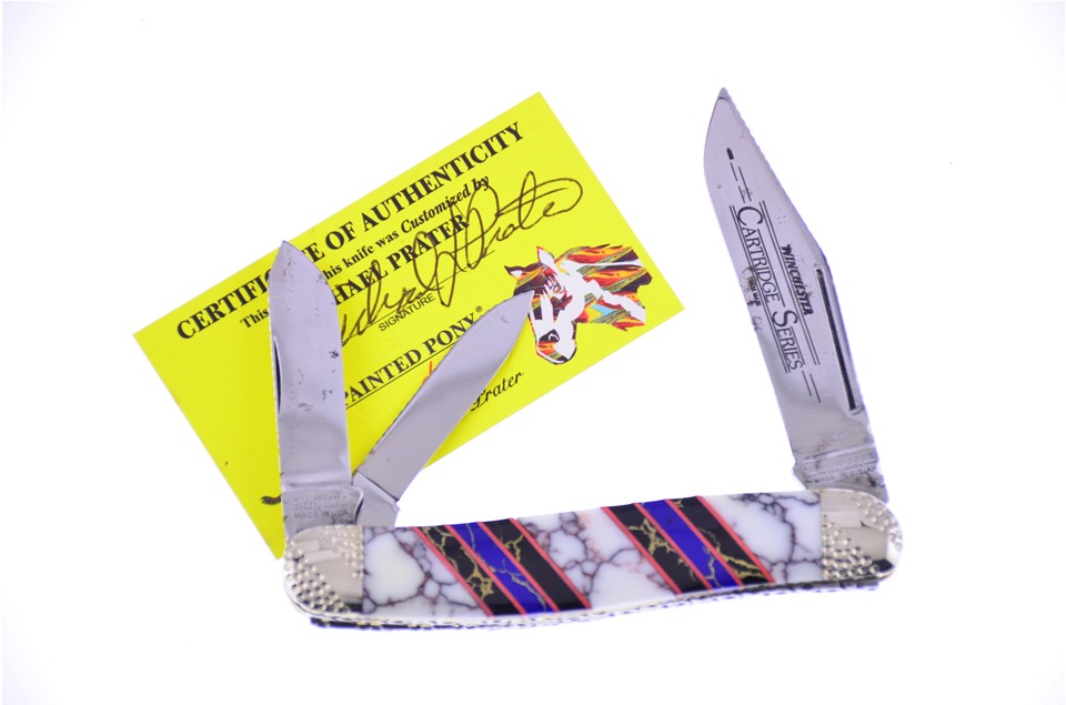 We think you're going to like this 4" Winchester Stockman with Wild Horse Jasper, Black and Gold Matrix and Purple Matrix Inlays. You need to pop this in your cart now while supplies last!