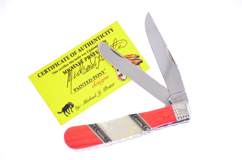 Here is a great 4 1/8" Trapper by Case! On the handle you will see Spiney Oyster and Mother Of Pearl, with Chevron Wood Inlays. No one can resist, so get yours while you can!