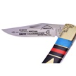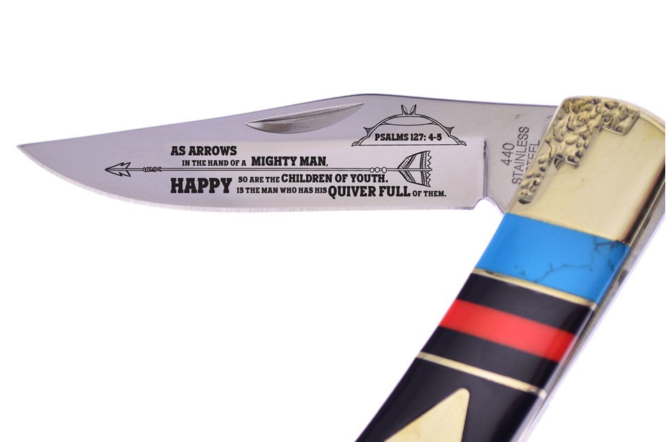 From Silverhorse Stoneworks, this new gift set includes a gorgeous lockback knife with arrowhead shield and hammered nickel silver bolsters. Comes with a small stone cross, organza gift bag and magnetic storage box.