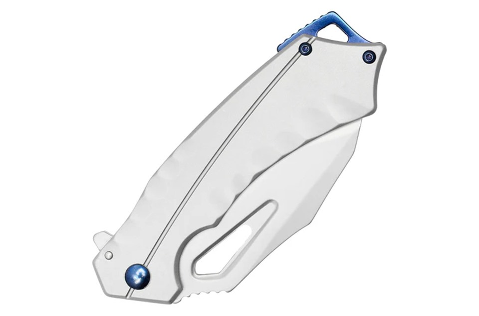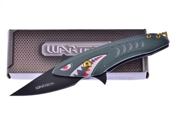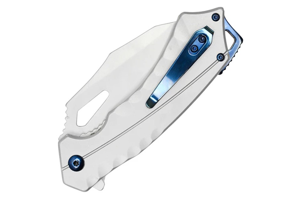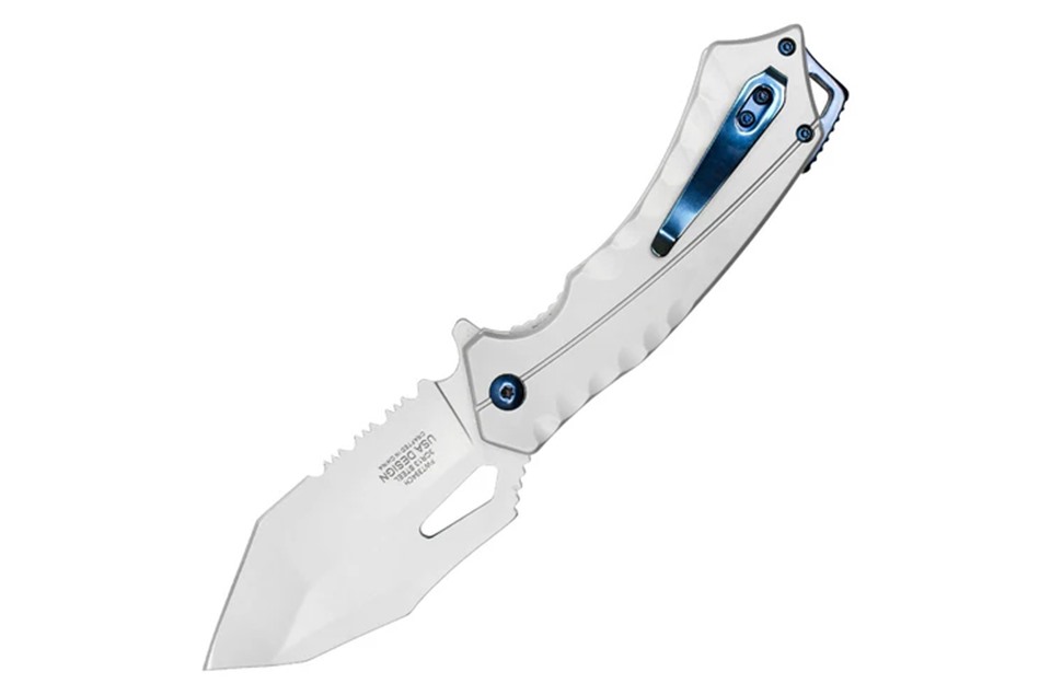 WarTech Rex is a little beast. At 4 1/2" closed, it fits nicely into your pocket and your hand, but performs like a much larger knife. The blade is beefy, with a tanto tip, half serrated, and a teardrop thumb hole for convenient opening. The assisted deployment comes out lighting fast using the flipper. The matte stainless blade had anodized blue accents, lanyard, and pocket/belt clip. Complete with liner lock function, this one will be your go-to EDC for years to come. Get it today at a special VIP price you can't resist!