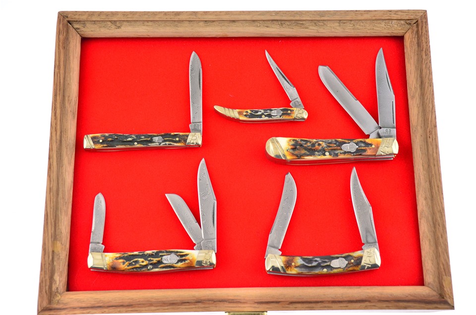 Here is a set of Rough Rider knives you don't want to miss! Included in this set is one of the Bonestag Toothpicks, one of the Bonestag Trappers, one of the Bonestag Mooses with [FEATURE], one of the Bonestag Doctor's Knifes with [FEATURE], one of the Bonestag Stockmans, one of the Oak Wood Display Cases with Display Case. You won't find a lower price anywhere!