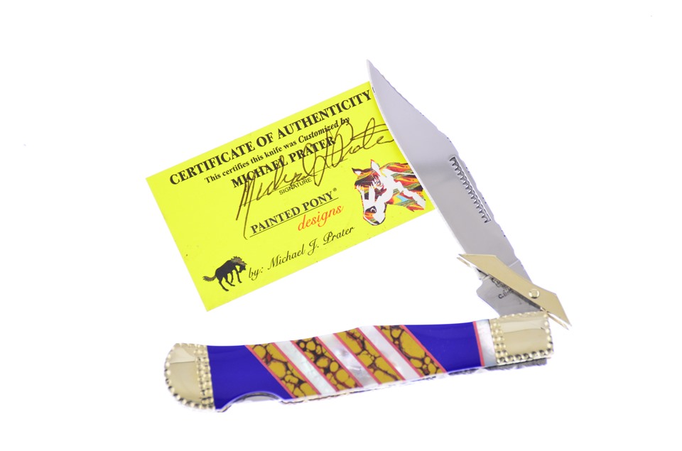 The Combination Swing Guard by Hen & Rooster is a long-time best-seller! On the handle you will see Blue Lapis with Yellow Dino and Pearl Inlays. This is going to be flying off the shelves, so don't miss your chance to get one!