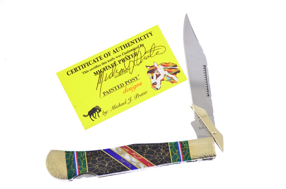 Here is a Beautiful Combination Stone Swing Guard by Hen & Rooster! The handle consist of Black Matrix, Golden Jade Stone with Blue/Red Matrix and Wild Horse Jasper Inlays. Stock is limited, so add to your cart before they are all gone.