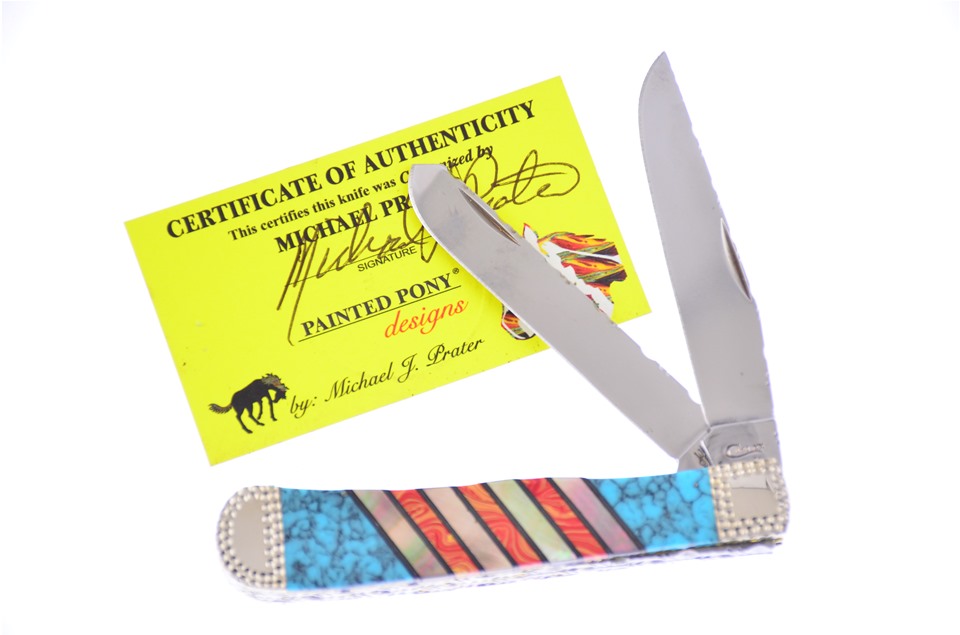 Case has really knocked it out of the park with this 4 1/8" Stone Trapper! The handle has beautiful Turquoise with Spiney Oyster and Pearl Inlays. Stock is limited, so add to your cart before they are all gone.