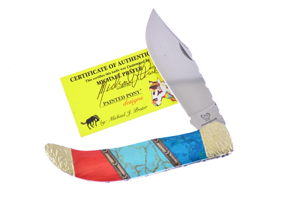 Customers can't get enough of the Hen & Rooster 5 1/2" Stone Clasp! The handle has two types of Turquoise, Spiney Oyster and Chevron Inlays. This item is going to sell like hotcakes, so get yours now.