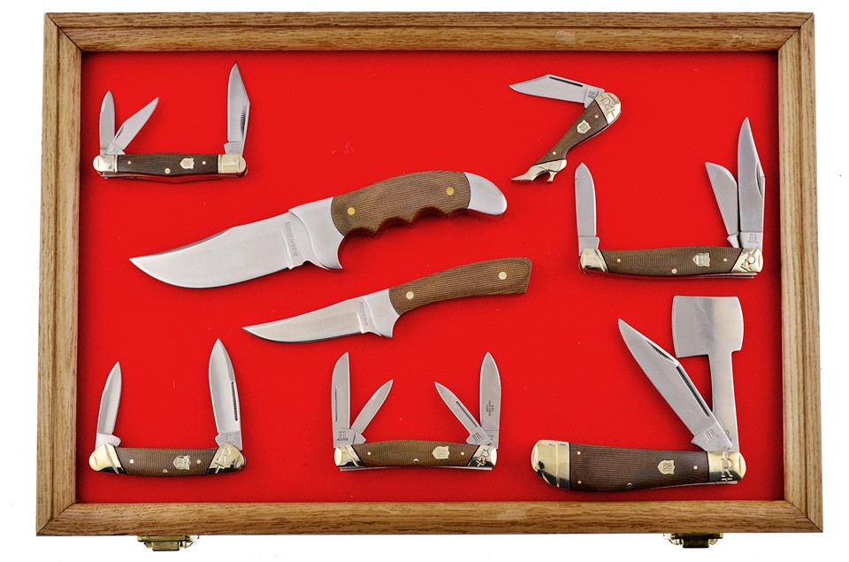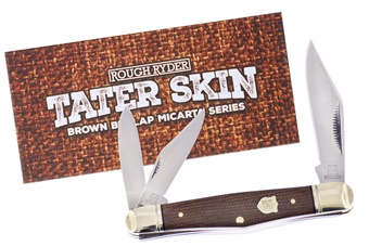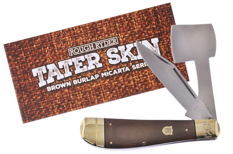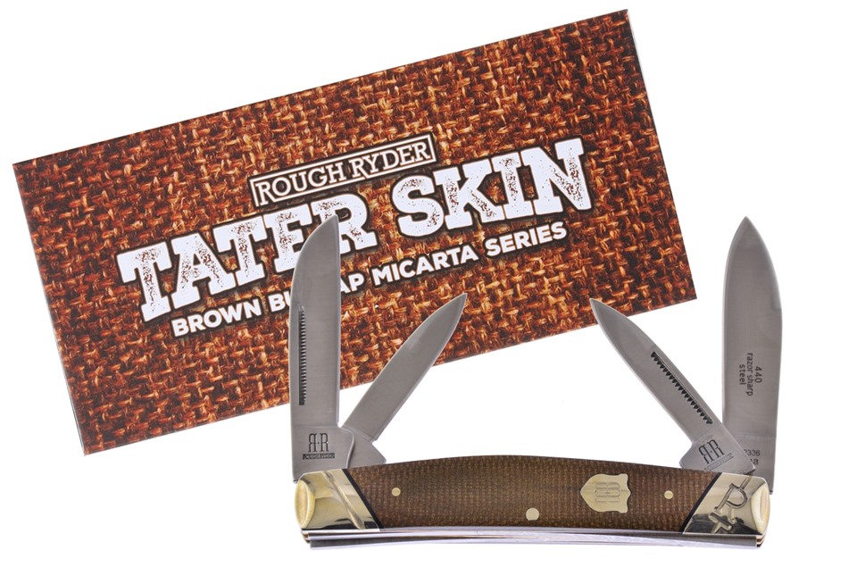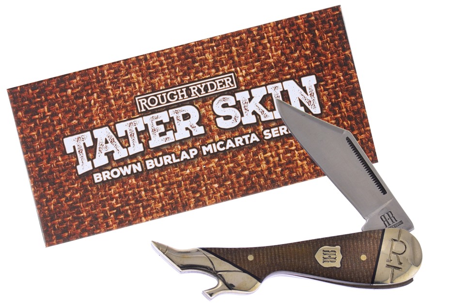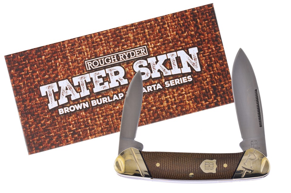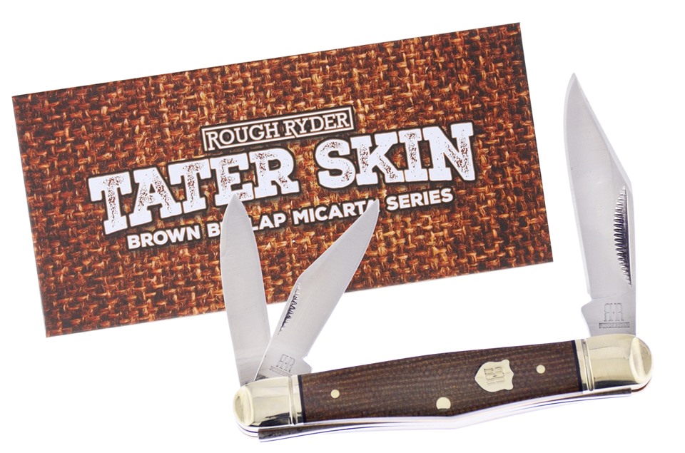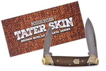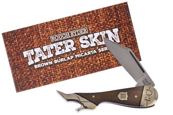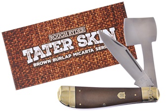 Just the thing for knife collectors everywhere. Rough Rider -Tater Skin Brown Burlap Micarta 8-Piece Collection.Featuring Satin finish stainless blades. Brown burlap micarta handles. Nickel silver bolster(s). Inlay shield. Each pocket knife comes individually boxed in a decorative "Tater Skin" magnetic gift box. Free hardwood display included. You won't find a lower price anywhere!