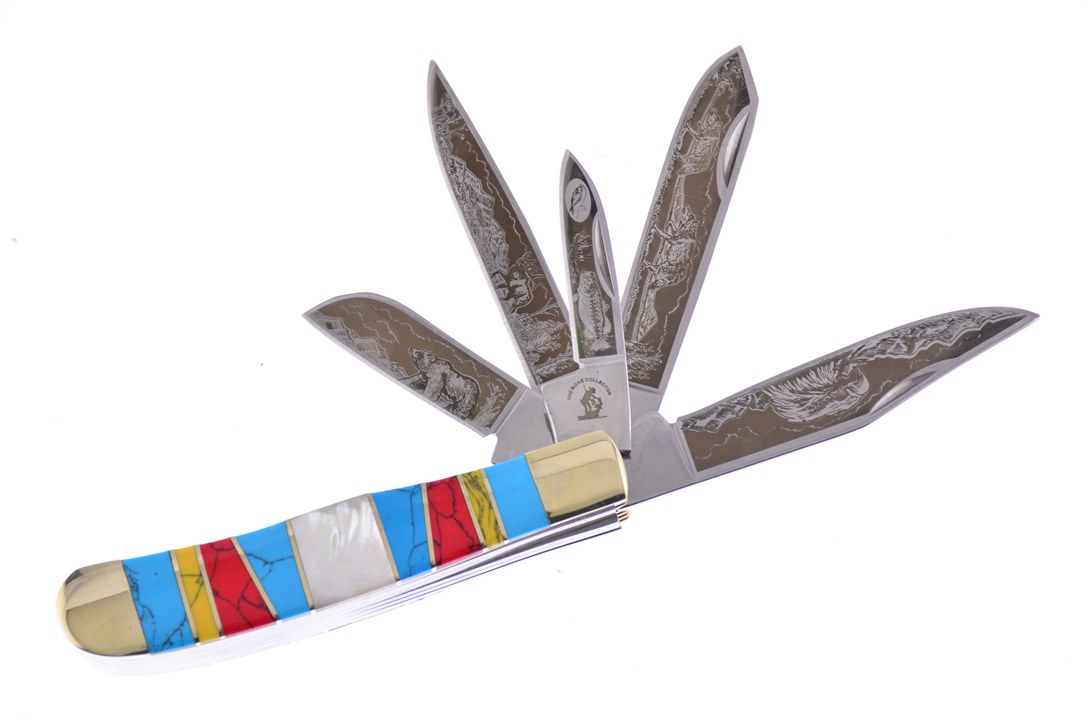 The 4 1/8" Turquoise Custom 5-Blade Trapper by Bone Collector USA is a long-time best-seller! You need to pop this in your cart now while supplies last!