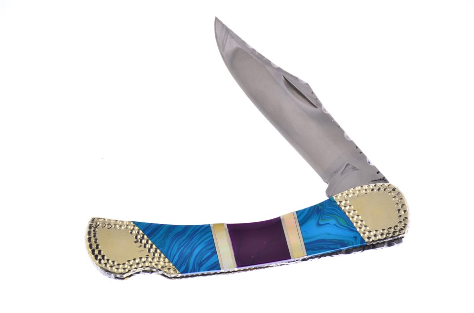 We think you're going to like this 5" Stone Lockback! On the handles you will see Chrysicolla and Purple Sugi Stone with Pearl Inlays. This is going to be flying off the shelves, so don't miss your chance to get one!