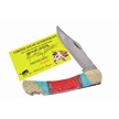 Here is A Beautiful Lockback by Painted Pony. On the handle you will see Spiney Oyster and Turquoise with Chevron Wood Inlays. This item will sale fast, so put it in your cart before it's gone.