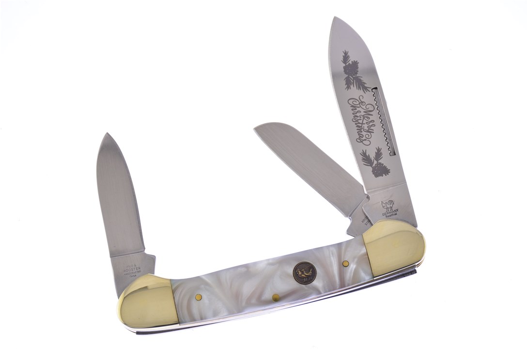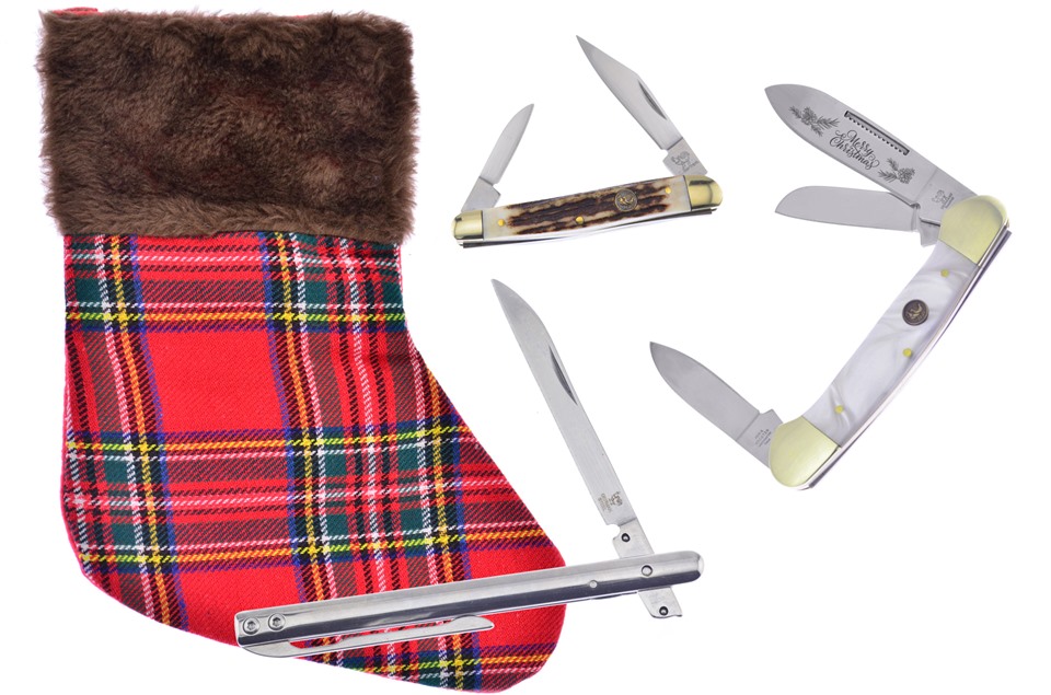 Three Hen & Rooster pocket knives in an adorable Christmas stocking--who could ask for a better way to make shopping easy! You get a genuine stag handle pen knife, a cracked ice large Canoe with rustic Merry Christmas laser engraving, and a stainless steel pocket clip knife. Don't miss out on this fantastic price.