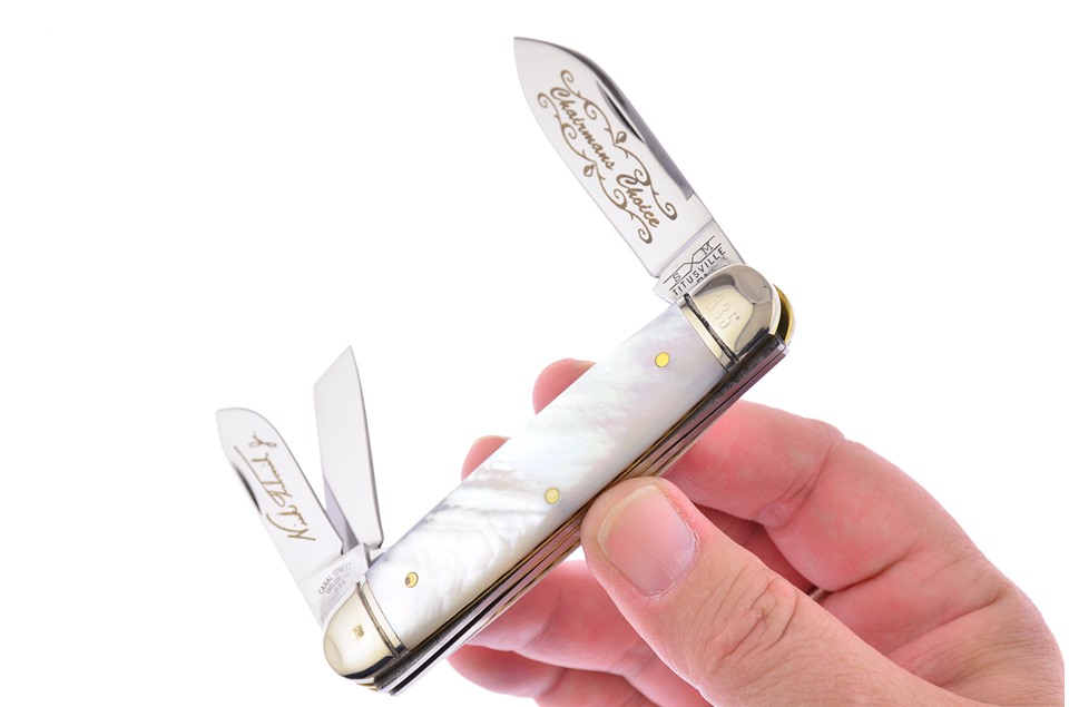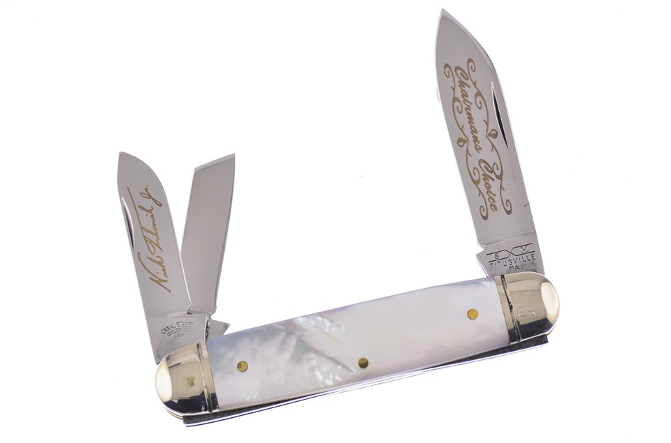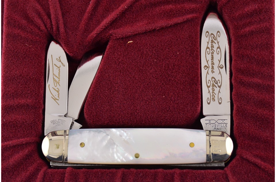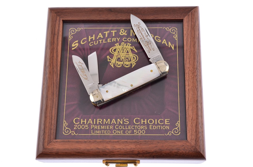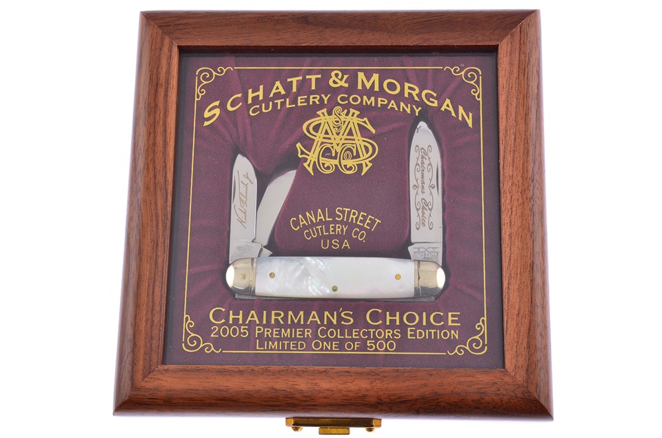 For serious collectors: 2005 Schatt & Morgan Cutlery Company "Chairman's Choice" winner. One of a kind from our private collection. This knife was a collaborative effort which has harnessed the expertise of a selected group of pocket knife masters from both Queen Cutlery Company and from Canal Street Cutlery Company. Their labors contributed to over 130 separate operations to create this hand crafted American heirloom. This rare pearl whittler is was the first knife that Queen Cutlery has ever co-branded and the first in Queen's premier Chairman's Collector Edition, and the first production knife completed by craftsmen at Canal Street Cutlery Co.. This is a 1 of 500 Premier Collector's Edition. It is serial #335 which is engraved on one of the dimpled, nickle silver bolsters. The handles are beautiful Mother of Pearl. The knife comes in a wood presentation case with embellished glass and velvet knife insert.