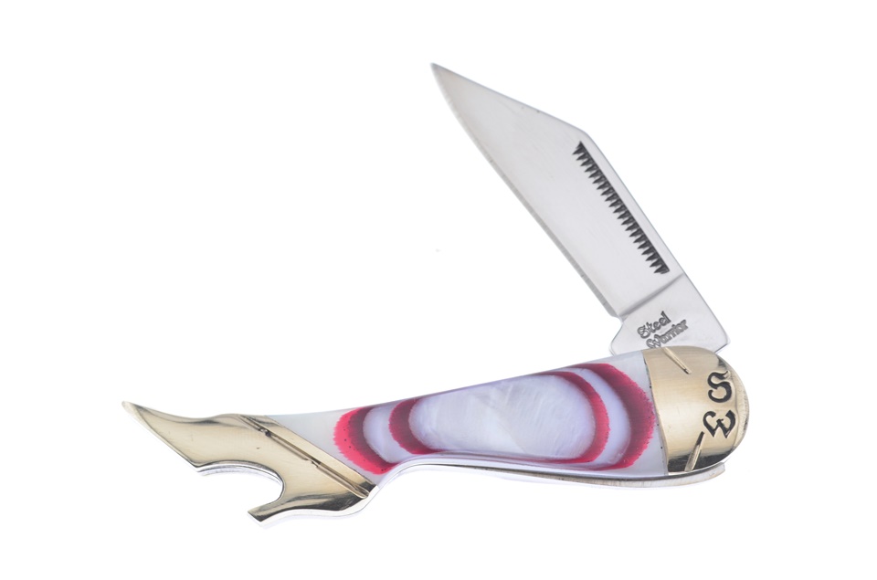 Steel Warrior fans are going to love this 3 1/4" Red Swirl Mother of Pearl Leg Knife! No one can resist, so get yours while you can!
