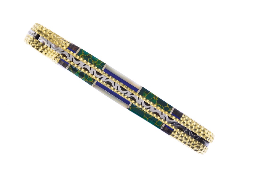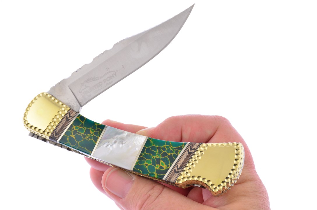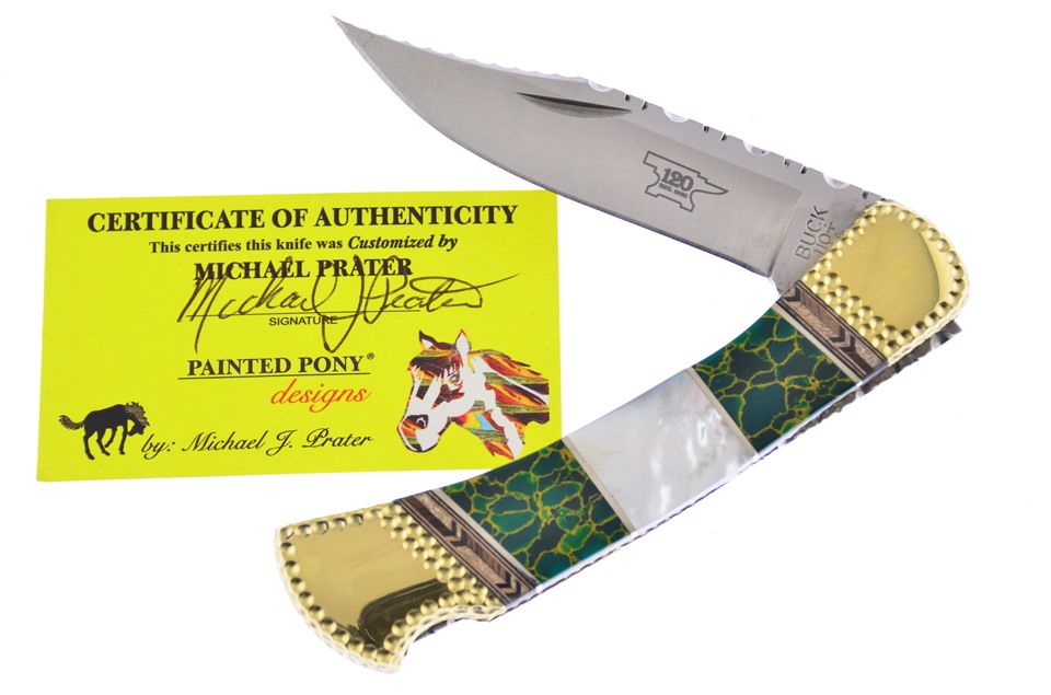 Buck has really knocked it out of the park with this 5" Combination Lockback! On the handle you will see Golden Jade Jasper Stone, Pearl and Chevron Wood Inlays. No one can resist, so get yours while you can!