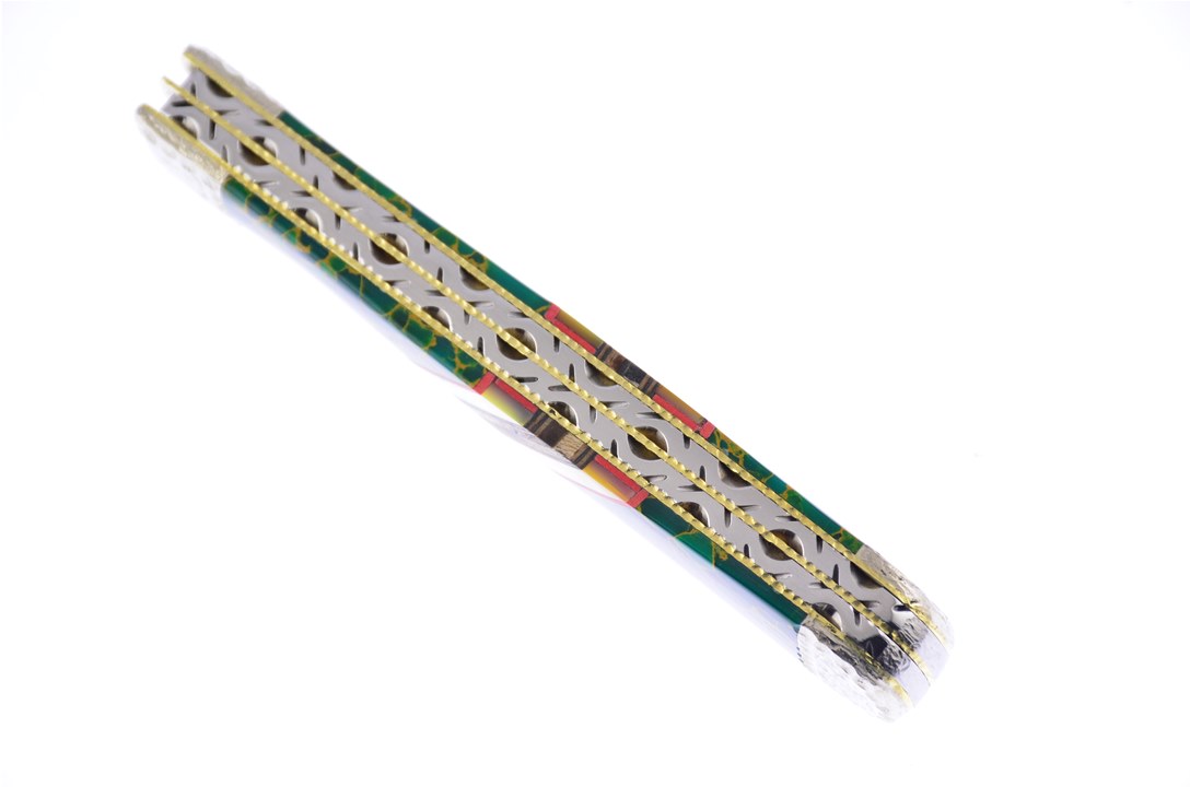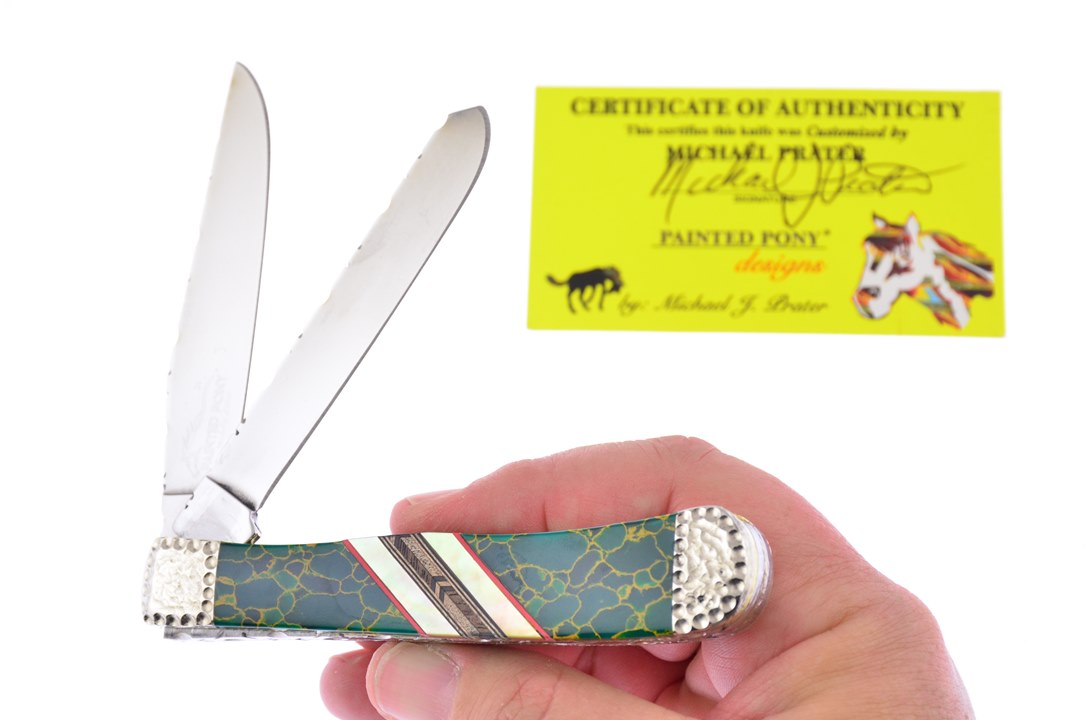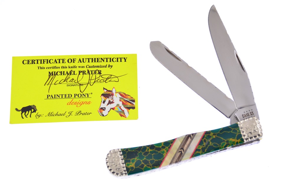 Case fans are going to love this 4 1/8" Combination Trapper! On the handle you will see Golden Jade Jasper Stone with Pearl and Chevron Wood Inlays. This is going to be flying off the shelves, so don't miss your chance to get one!