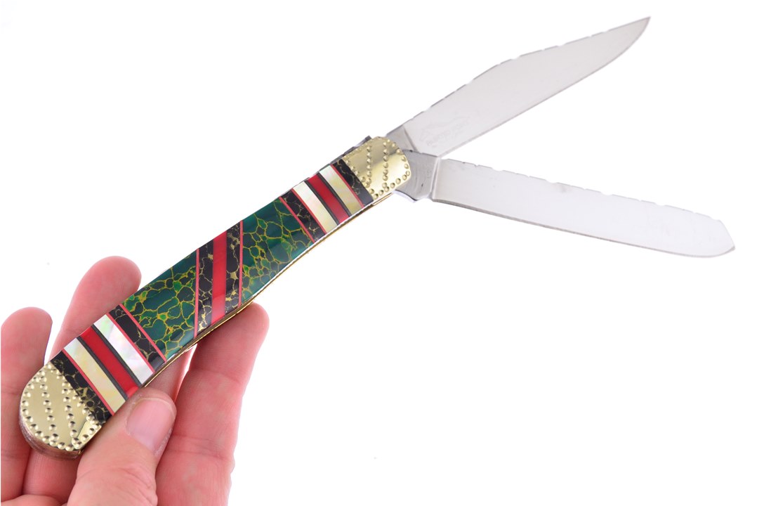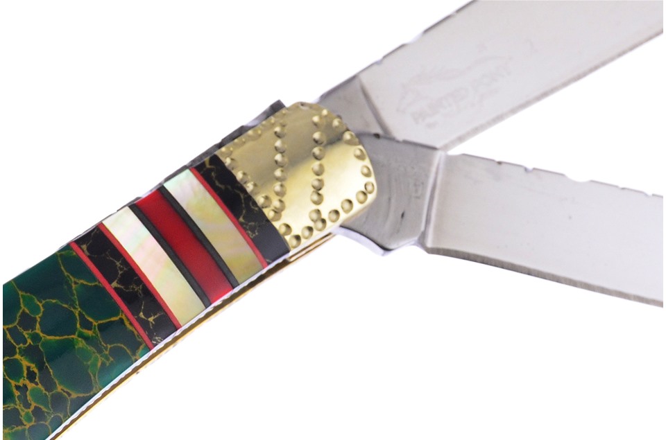 The 5 1/4" Combination Trapper by German Bull is a long-time best-seller! On the handle you will see Golden Jade Jasper Stone with Black and Gold Matrix, Red Coral, and Pearl Inlays. You need to pop this in your cart now while supplies last!