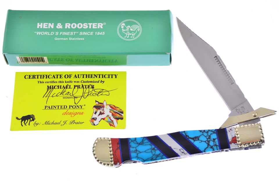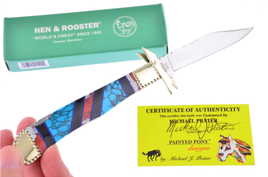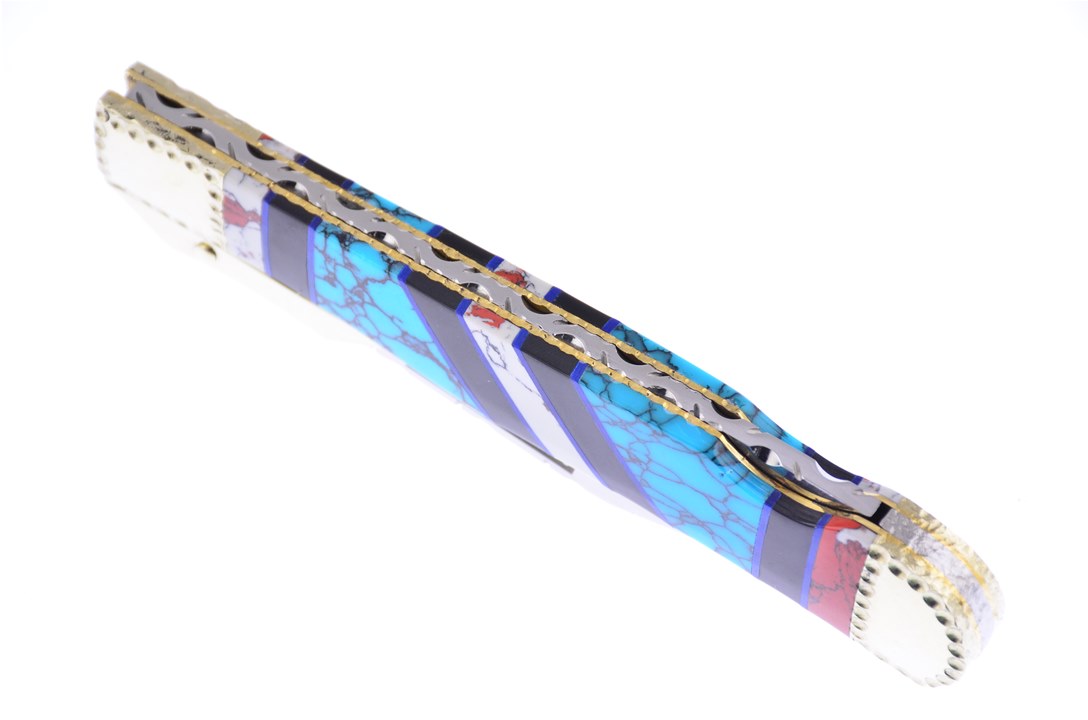 We think you're going to like this 5" Combination Swing Guard! On the handle you will see Turquoise Web with Pony Jasper, Wild Horse Jasper, Red Turquoise and Jett Black Onyx Inlays. This is going to be flying off the shelves, so don't miss your chance to get one!