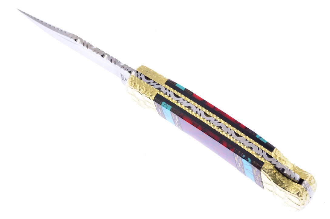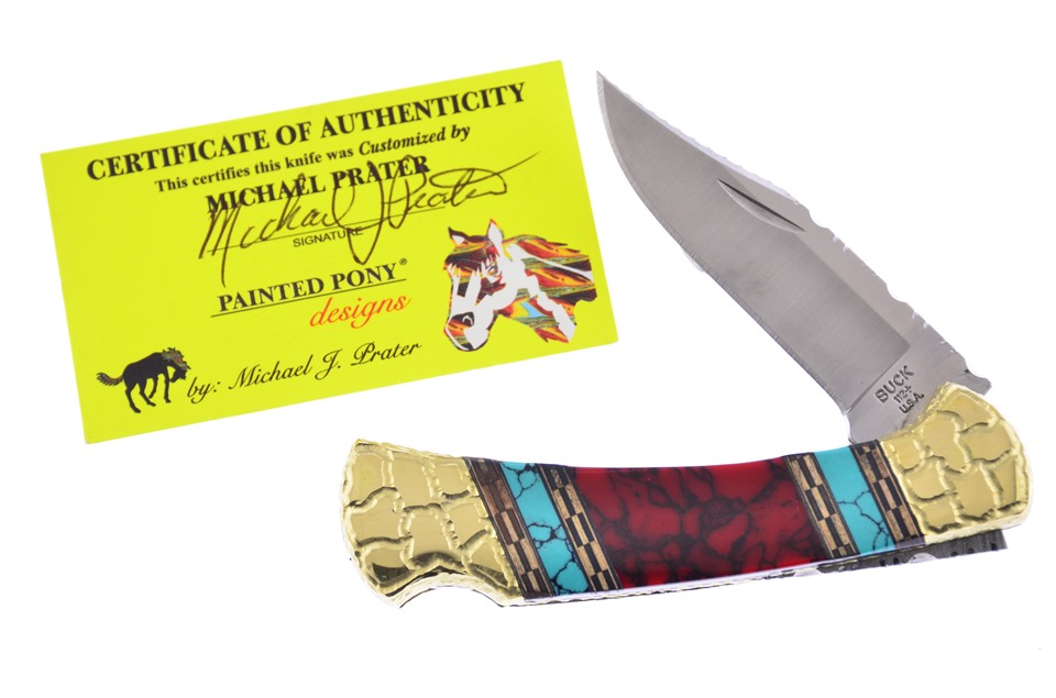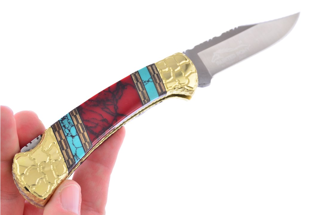 This Buck 4 1/4" Combination Lockback is a customer favorite! On the handle you will see Blood Red Turquoise with Turquoise and Chevron Wood Inlays. This item is going to sell like hotcakes, so get yours now.