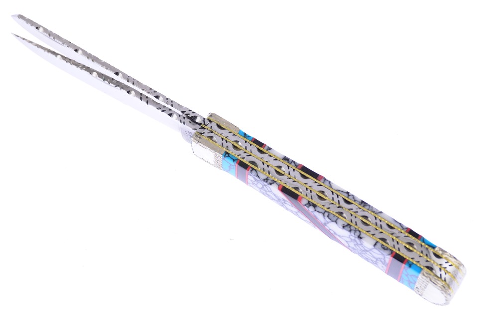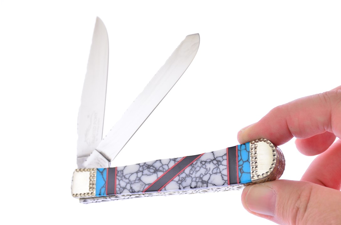 Here is a great 4 1/8" Trapper by Case! On the handle you will see Wild Horse Jasper Stone With Turquoise and Black Jett Onyx Inlays. Stock is limited, so add to your cart before they are all gone.
