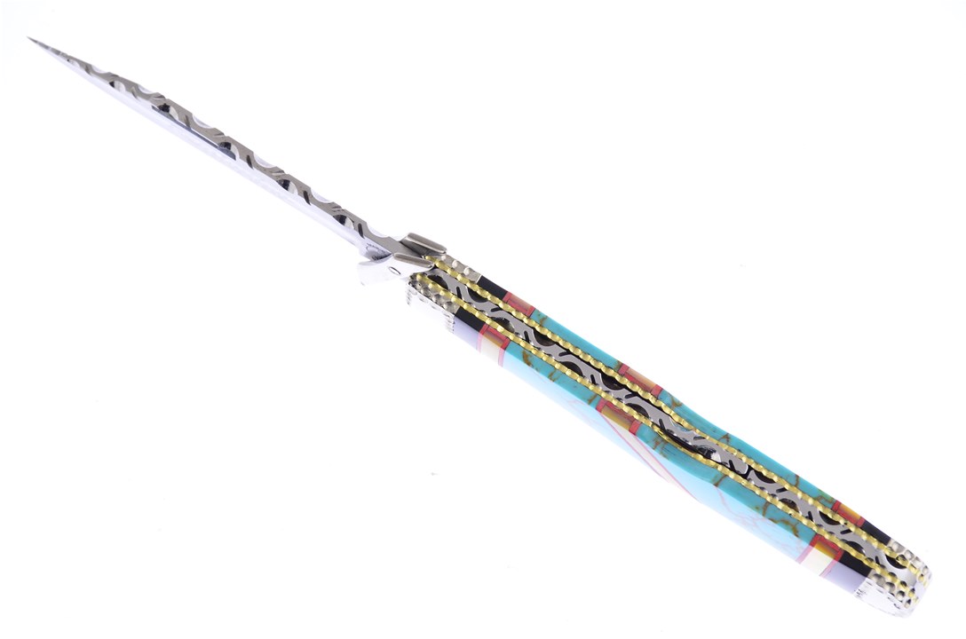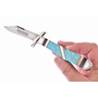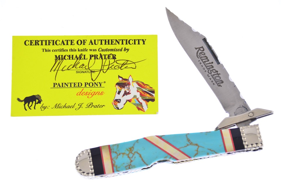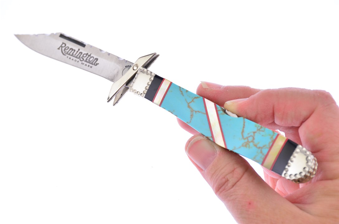 The 4 1/2" Combination Swing Guard by Remington is a long-time best-seller! On the handle you will see Kingman Turquoise With Pearl and Black Onyx Inlays. Stock is limited, so add to your cart before they are all gone.