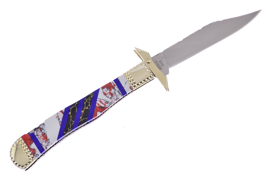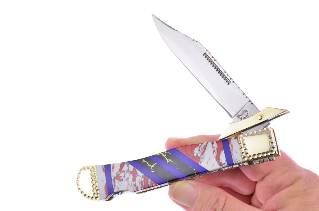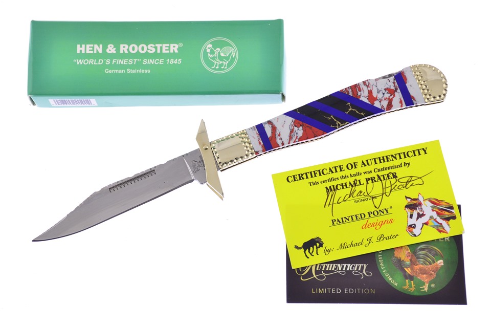 Here is a great 5" Swing Guard by Hen & Rooster! On the handle you will see Pony Jasper Stone, Black and Gold Matrix With Blue Lapis Inlays. This is going to be flying off the shelves, so don't miss your chance to get one!