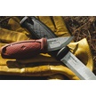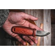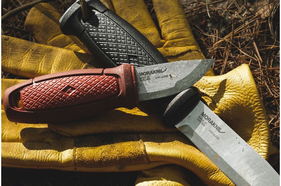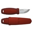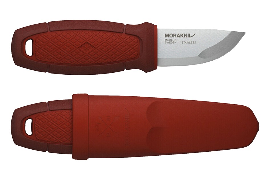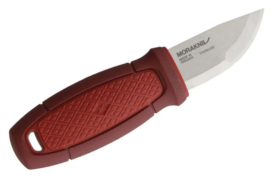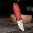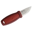The Morakniv Eldris is a pocket size fixed blade knife that will amaze you with its versatility. Knife and Sheath Only. The stainless Sandvik blade has a semi-matte finish. The spine of the blade is squared off for use with a fire starter (ferro rod). The handle is rubberized with a checkered hard plastic insert. It's symmetrical to facilitate use of the knife with the edge either up or down. The handle is fairly stout in diameter, so it feels good in a variety of hand sizes. The knife locks firmly into the simple plastic sheath. It's intended to be carried in the pocket or pack. It doesn't come with any way to attach it to a belt or neck thong. Think of it as an extra stout pocket knife that doesn't fold.