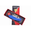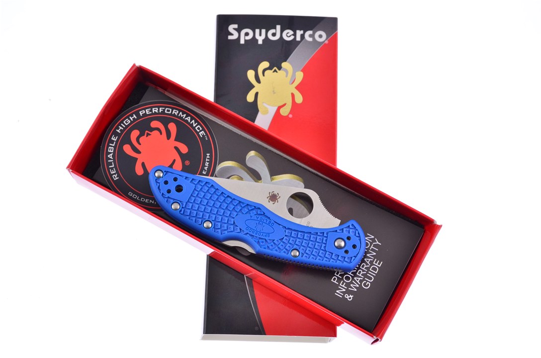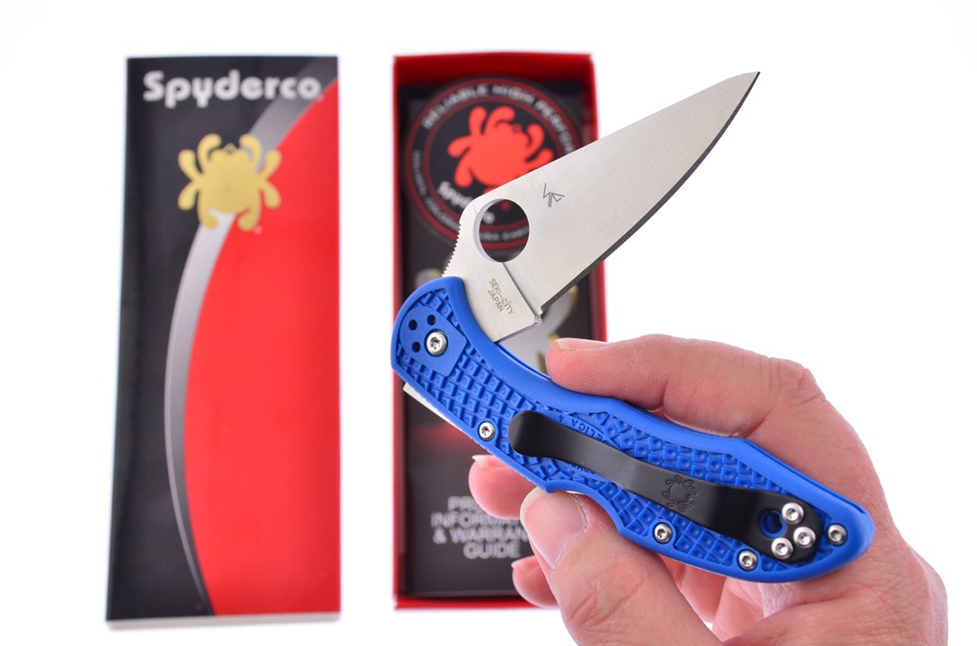 This Delica 4 also features a blue handle injection molded from lightweight fiberglass-reinforced nylon (FRN). The handle scales proudly feature a Bi-Directional Textured pattern for a secure, non-slip grip and nested, skeletonized stainless steel liners for superior structural strength. They also support the knife's sturdy back lock mechanism and its black four-position clip, which is configurable for left or right.