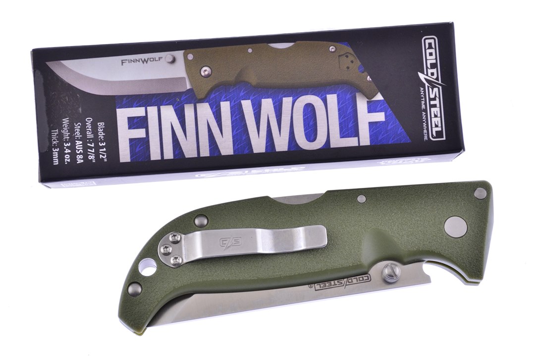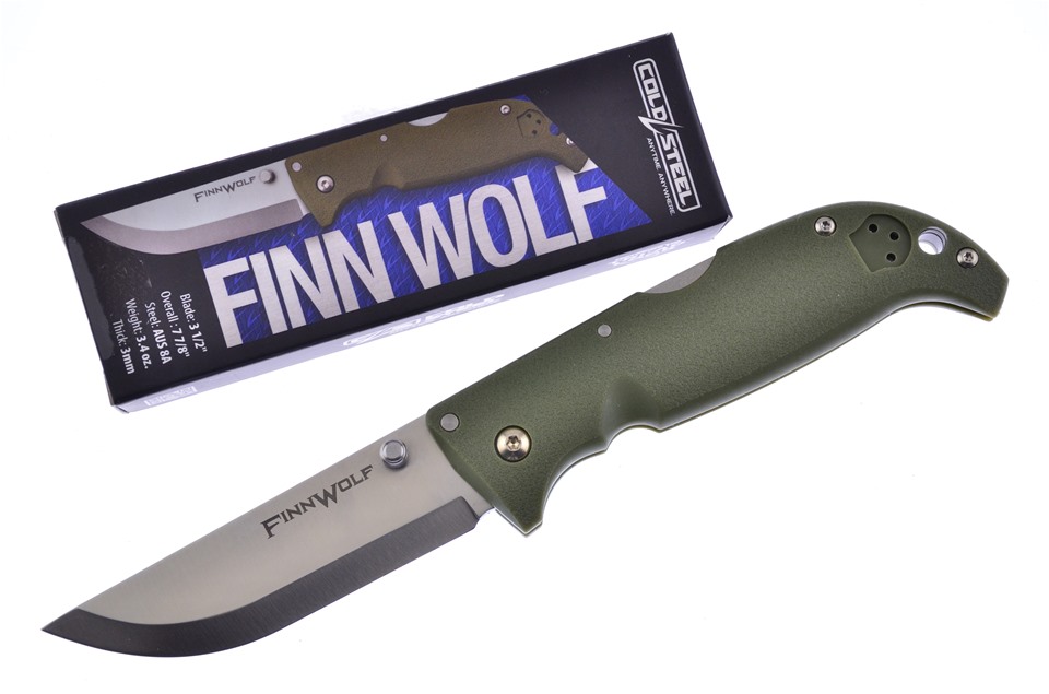 A design collaboration between custom knife-maker Andrew Demko and Cold Steel President Lynn C. Thompson, the Cold Steel Finn Wolf is a folding utility and camp knife that draws inspiration from the classic Finnish Pukko. Equipped with our Tri-Ad lock for superior safety and security, the Finn Wolf is a folder that you can rely on in even the most uncompromising conditions. Its satin polished Japanese AUS 8A blade is ready to put in long hours and hard work, and with its keen zero ground edge it's a breeze to re-sharpen in the field. With this much performance packed into this comfortable, strong, practical and inexpensive a package, there's simply no excuse not to add a Finn Wolf to your collection today!
