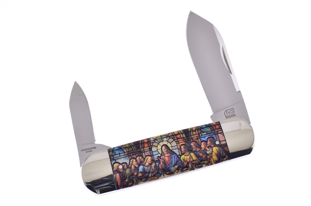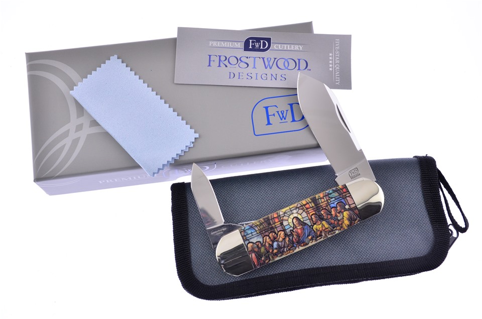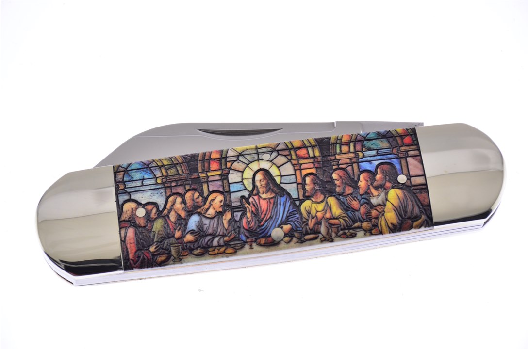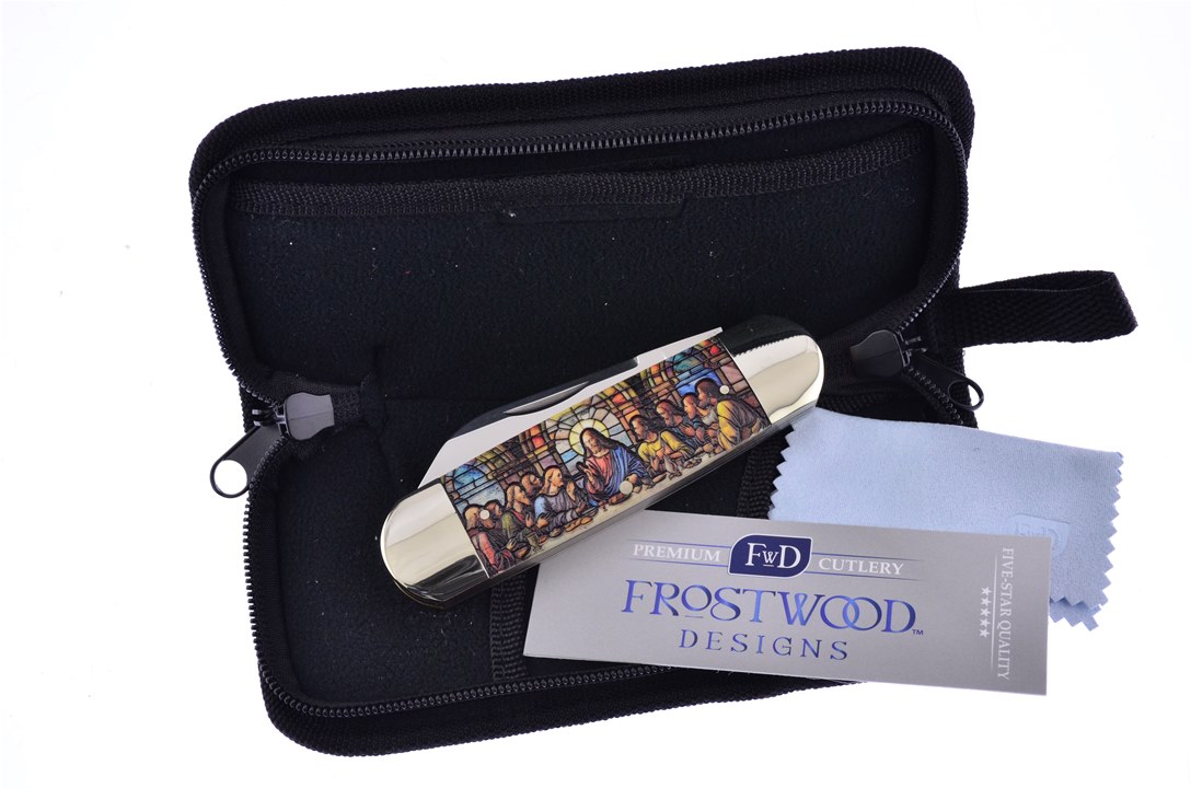 You do not want to miss your chance to buy The Last Supper Knife by Frostwood Designs. This knife has a beautiful etched smooth bone handle that provides a colorful hand painted scene. It comes with a cleaning cloth and case, allowing you to keep it in pristine condition for your collection.
