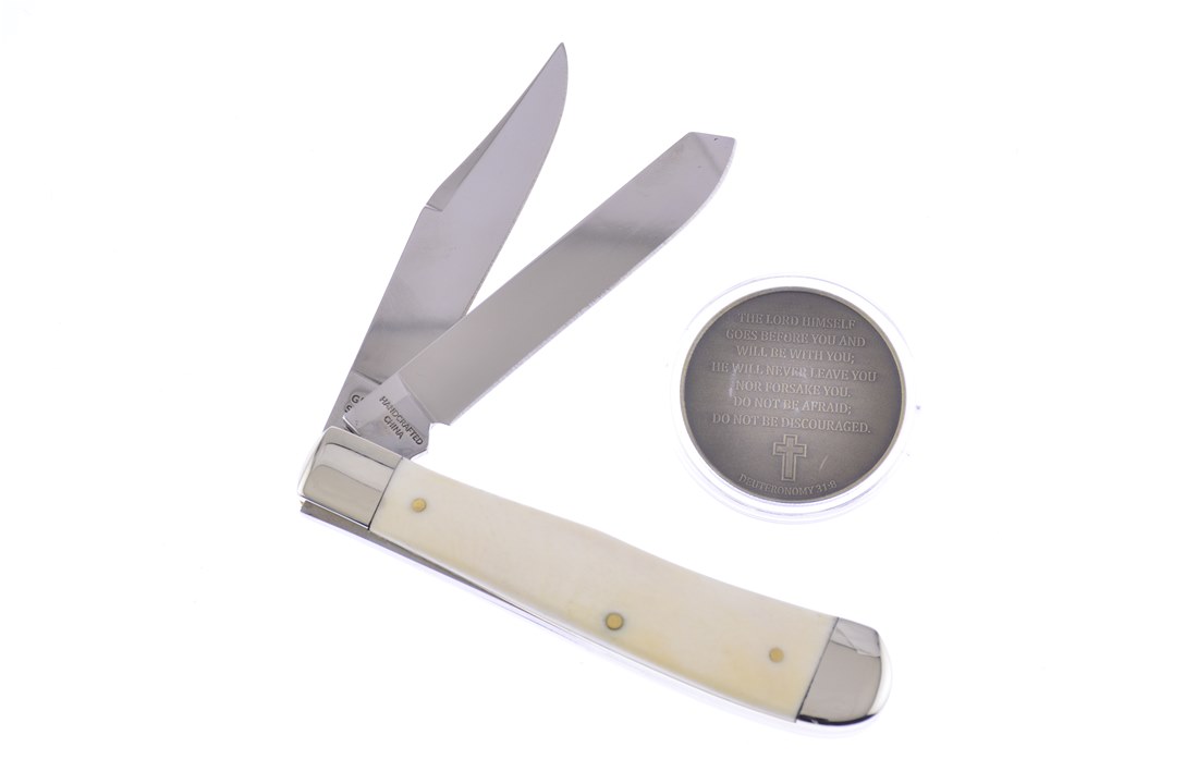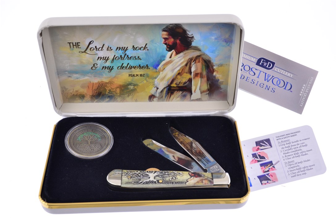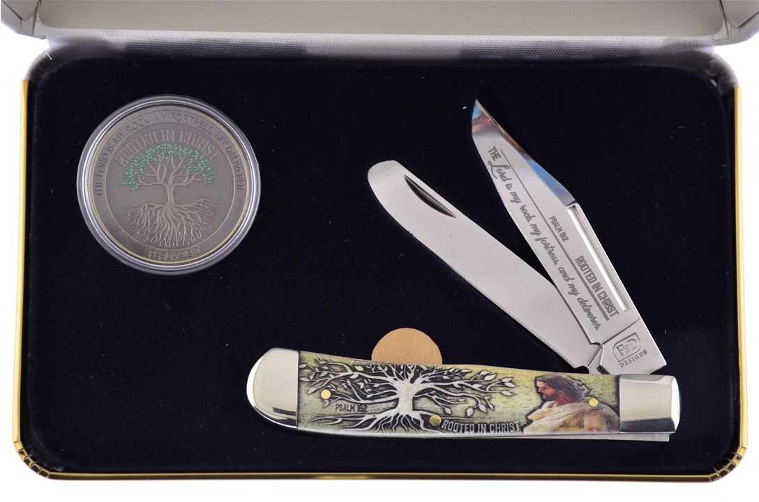 Frostwood Designs has done it again with this intricately designed Rooted in Christ trapper. The blade is made of german stainless steel, allowing the user durability and longevity, while also including an artistic element by including an engraving of Psalm 18:2. The smooth bone handle has been etched and hand-painted allowing your functional pocket knife to turn into a piece of art in your pocket. Do not miss your chance to add this to your collection today!