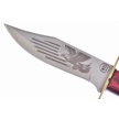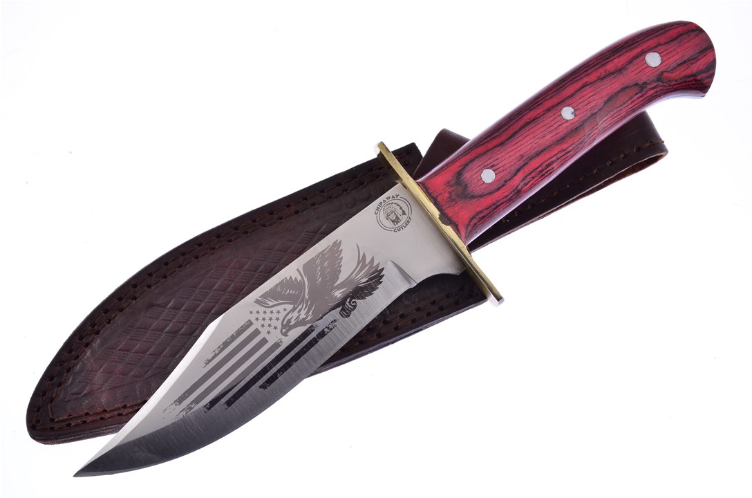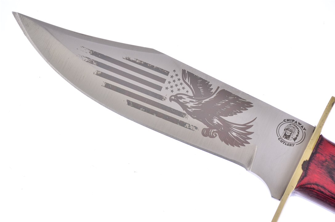 This 10.5" bowie by Chipaway Cutlery features a stainless steel blade with an etching of an eagle and American flag. Because of its full tang structure, your blade will remain reliable even when put up to demanding tasks. It comes with a leather sheath, making carrying easy and convenient. Do not forget to add it to your cart today!