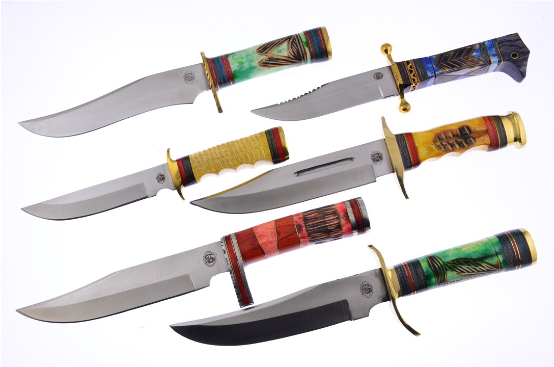 Frost Cutlery is bringing you this 6 piece bone bowie set by Chipaway. This roundup includes two green bone, one red bone, two yellow bone and one blue bone bowie(s), all ranging from 10 to 12 inches in length. Each bowie comes with a sheath, allowing for each carrying access. You do not want to miss your chance to add this set to your collection.