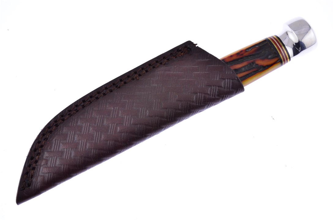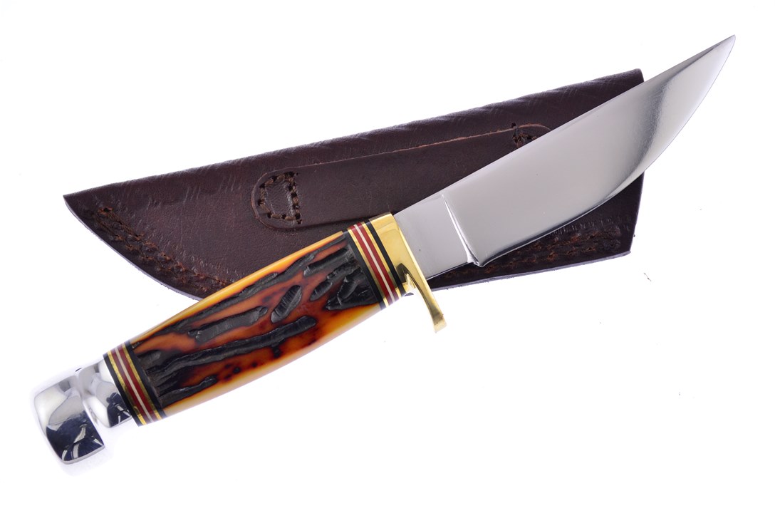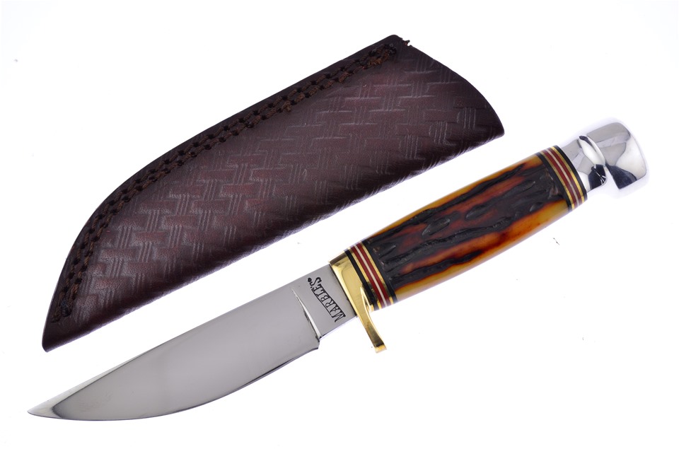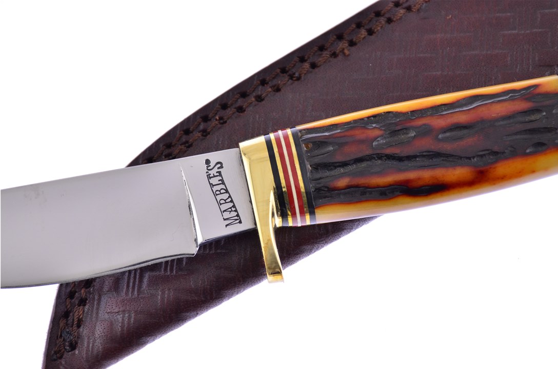 Do not miss your chance to get this USA Marbles Hunter! This fixed blade features a bone handle with a hidden tang construction, offering a sleek look that also provides balance and strength during use. By including a brass guard, it also allows for your hand to be protected, giving you more control. The leather sheath it comes with also attaches to a belt making access easy. This would make a great additon to your collection today!