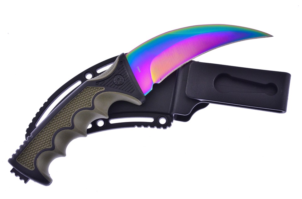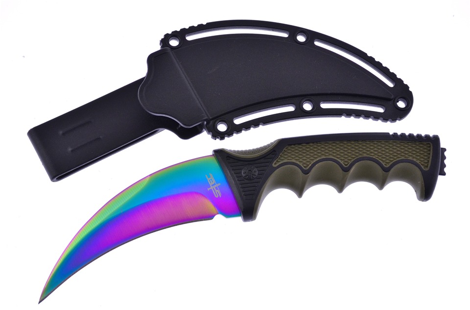 Introducing a new Stel Karambit knife! This karambit features a titanium coated blade that adds to the aesthetic appeal but also adds to the durability of the knife. The handle is designed for comfort and control, providing a secure grip for safe and effective cutting. It comes with a plastic sheath that can be clipped on to a belt, or you can put it on a lanyard. Both of these options allow for quick access if needed. This also features a window breaker at the bottom, making it a great option to keep in your car in case of an emergency.