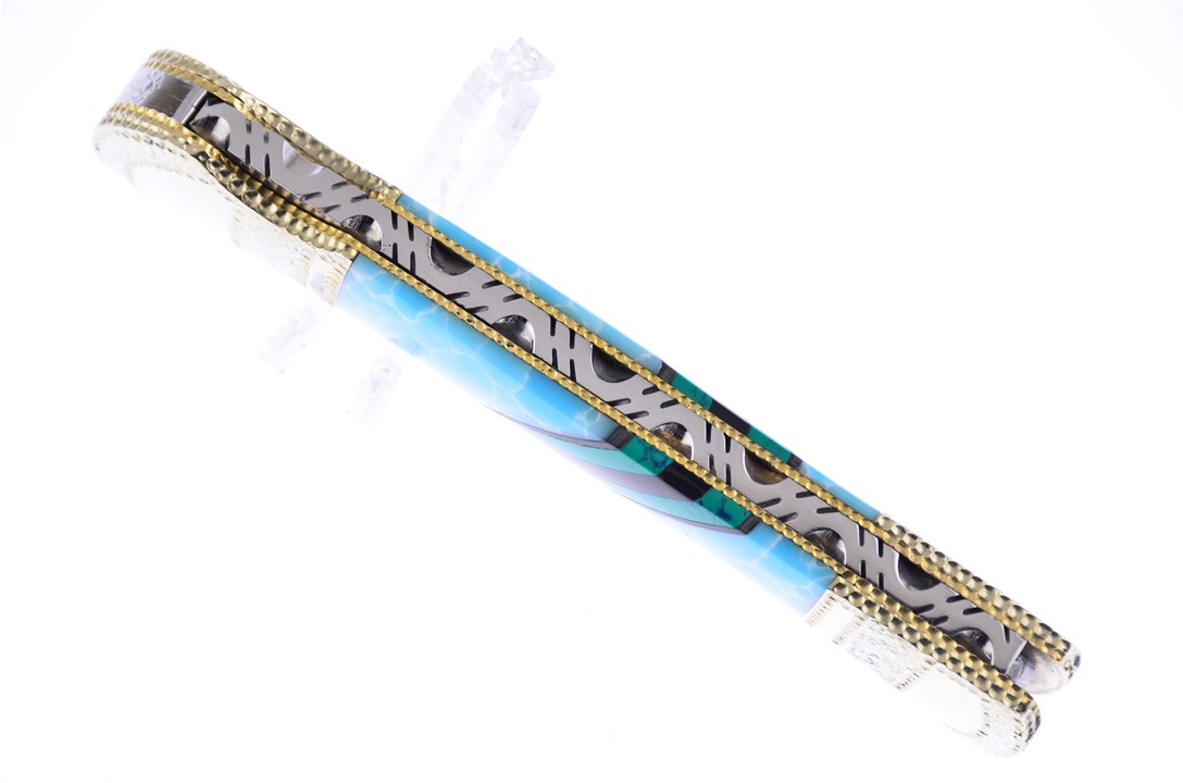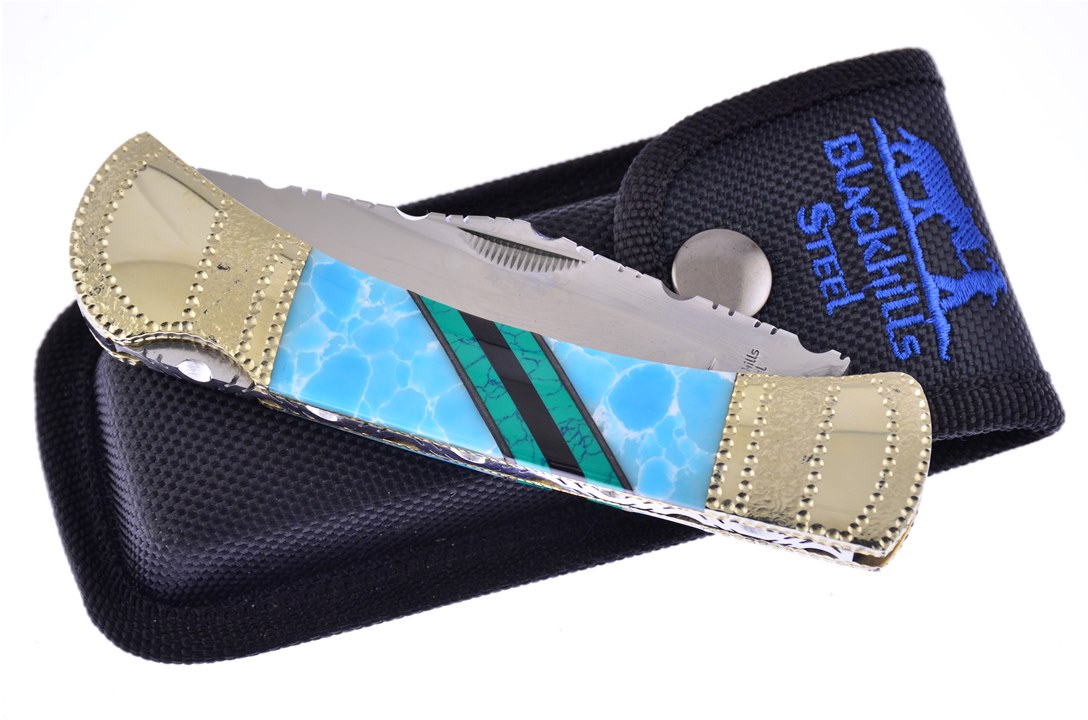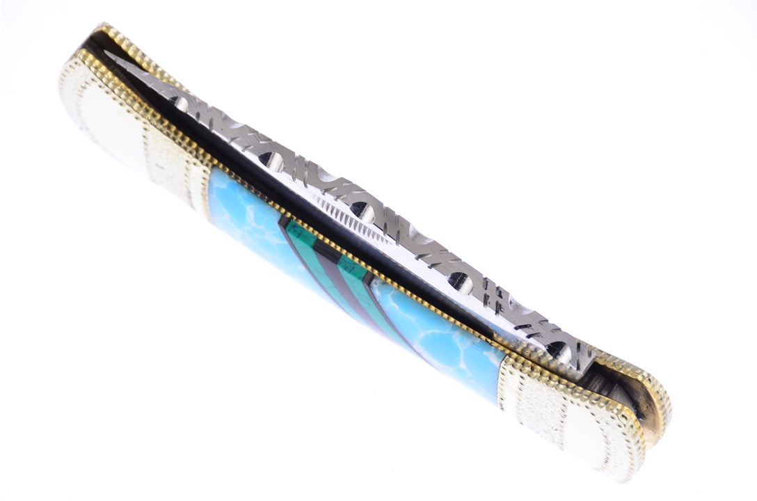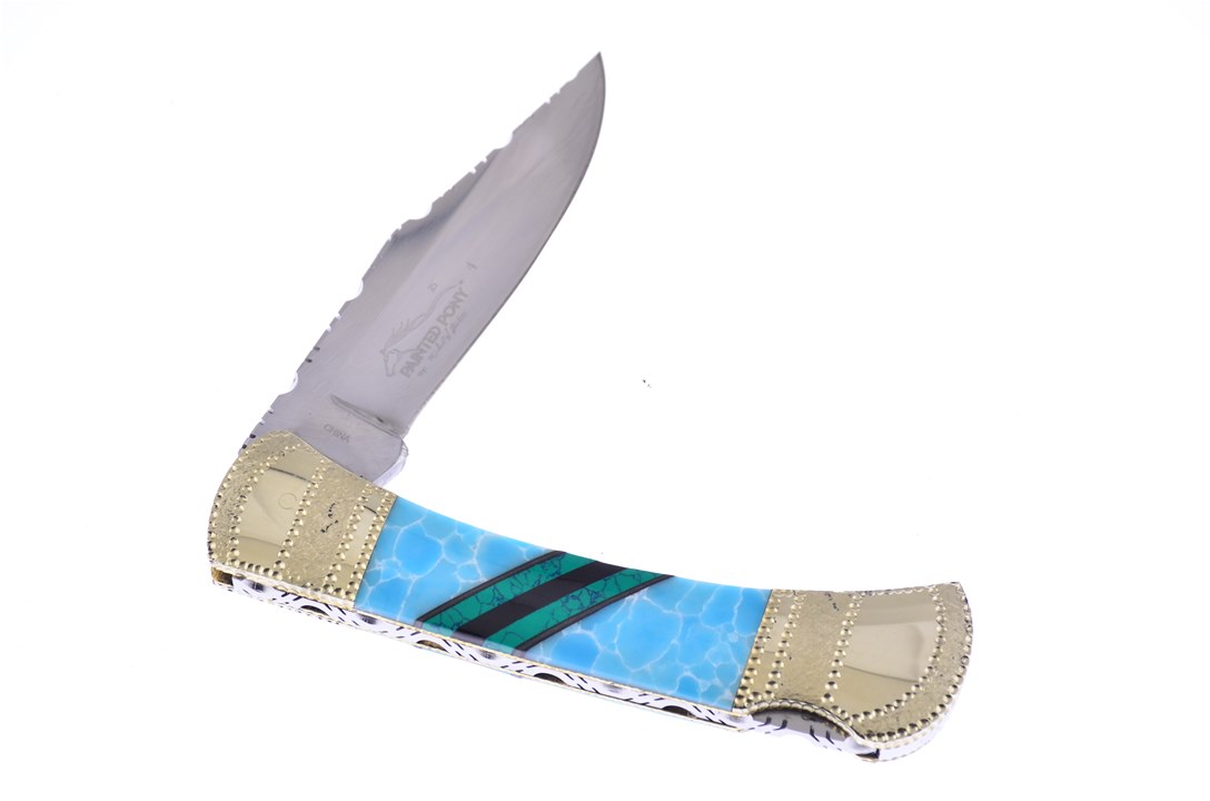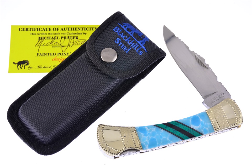 Introducing the 5" Stone Larimar Lockback by Painted Pony with beautiful Malachite Web and Black Onyx Inlays. You need to pop this in your cart now while supplies last!