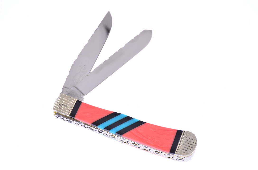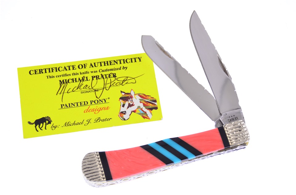 Here is a great 4 1/8" Spiney Trapper by Case with beautiful Black Onyx and Sleeping Beauty Turquoise Inlays! This is going to be flying off the shelves, so don't miss your chance to get one!
