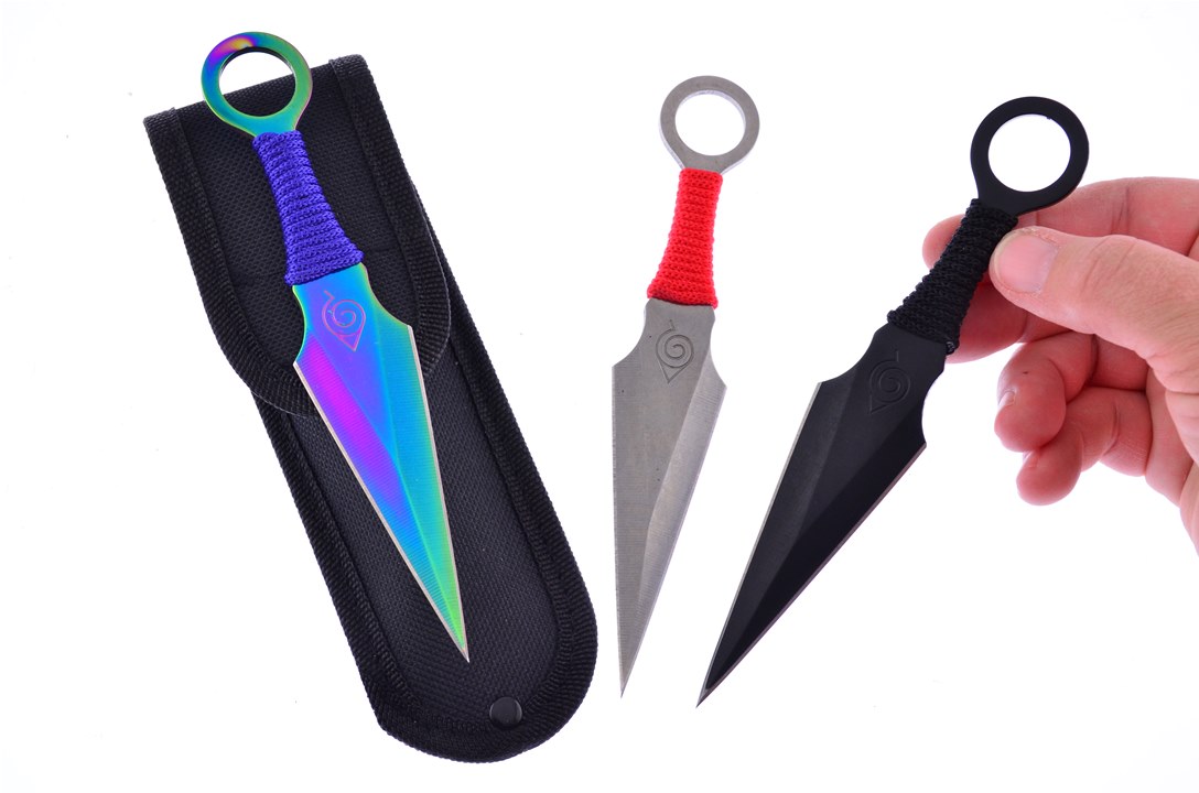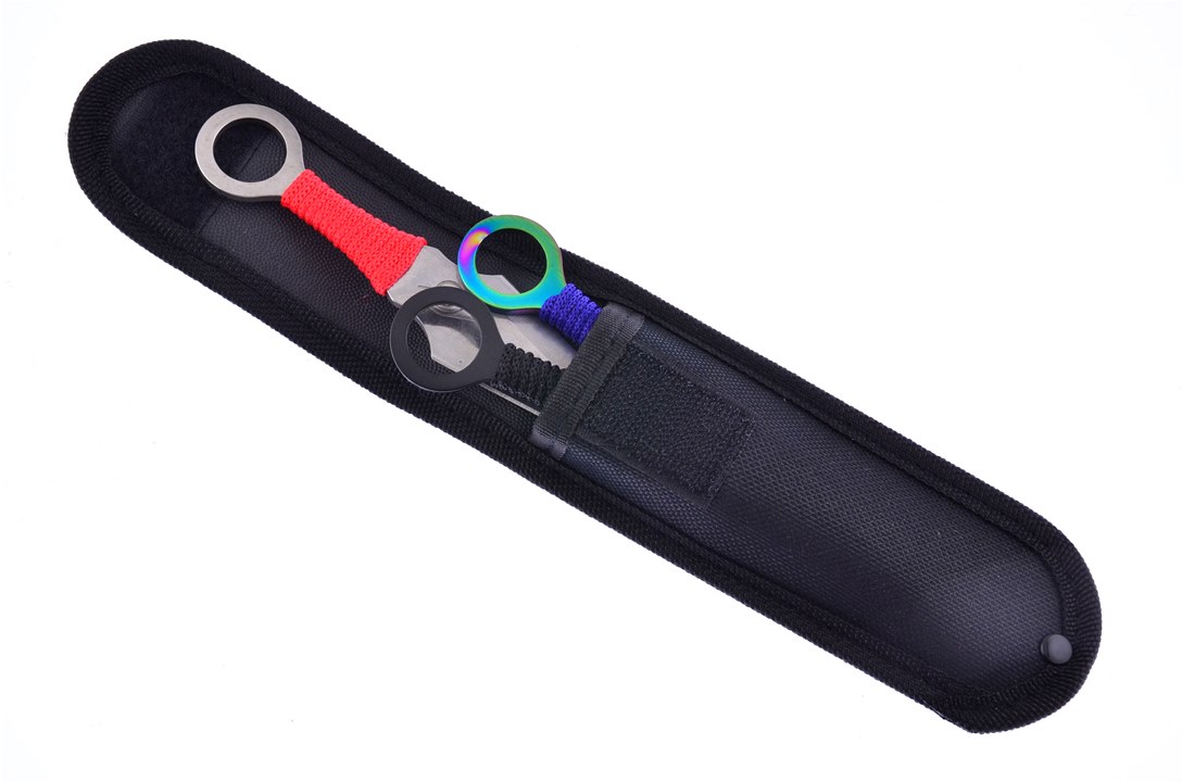 Do not miss your chance to get this set of throwing knives! This set features three throwing knives all with different color handles and blades. Each knife is lightweight and fits nicely into your grip because of the shape of the handle. A nylon seath is also part of this set making carrying easy. Add it to your cart today before this set is gone!
