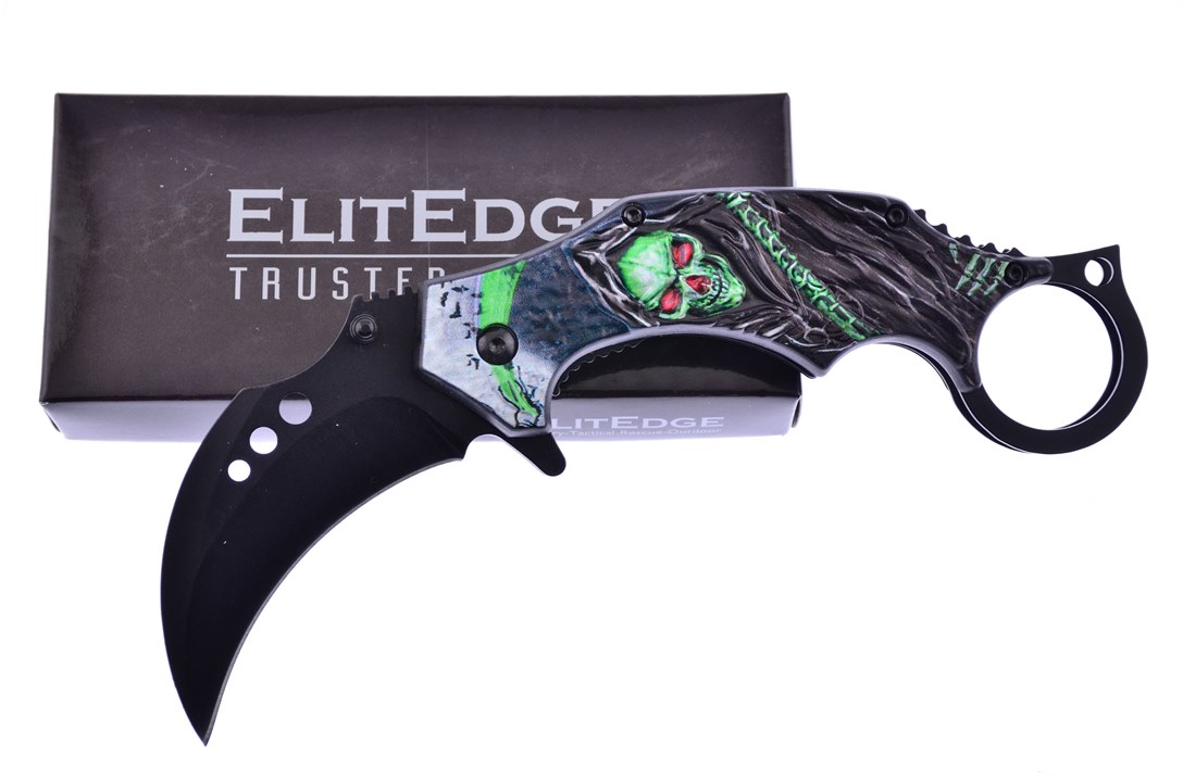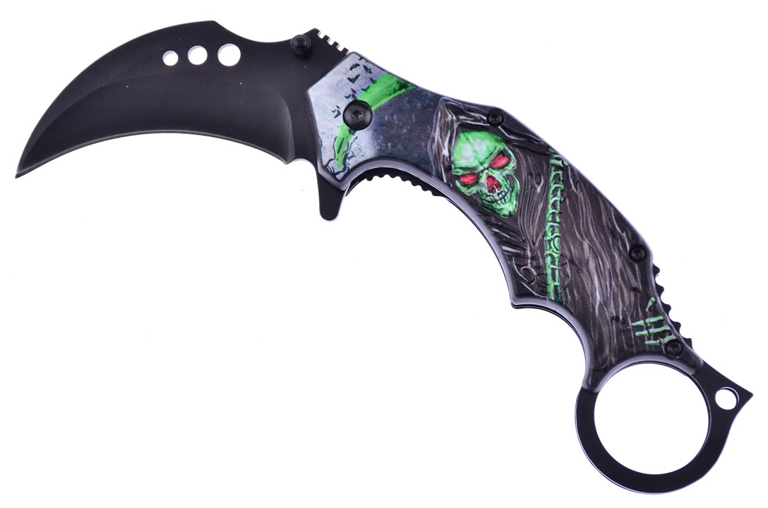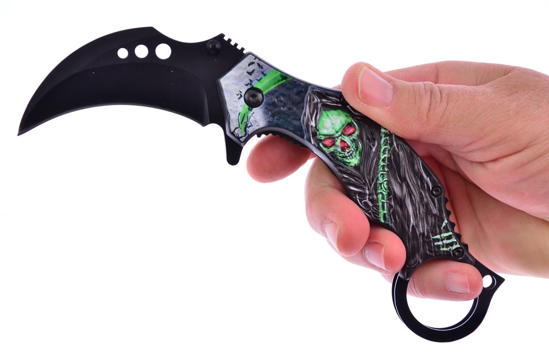 It may not be Halloween yet but this is any horror movie lovers dream! This karambit features a 3D green grim reaper on its handle with a black matte stainless steel blade. Designed for precision and longevity, the stainless steel blade is built to resist corrosion and maintain a sharp edge with minimal maintenance. This makes it the perfect addition to anyones collection who wants to be able to show off a little bit of their personality while also having a functional tool.