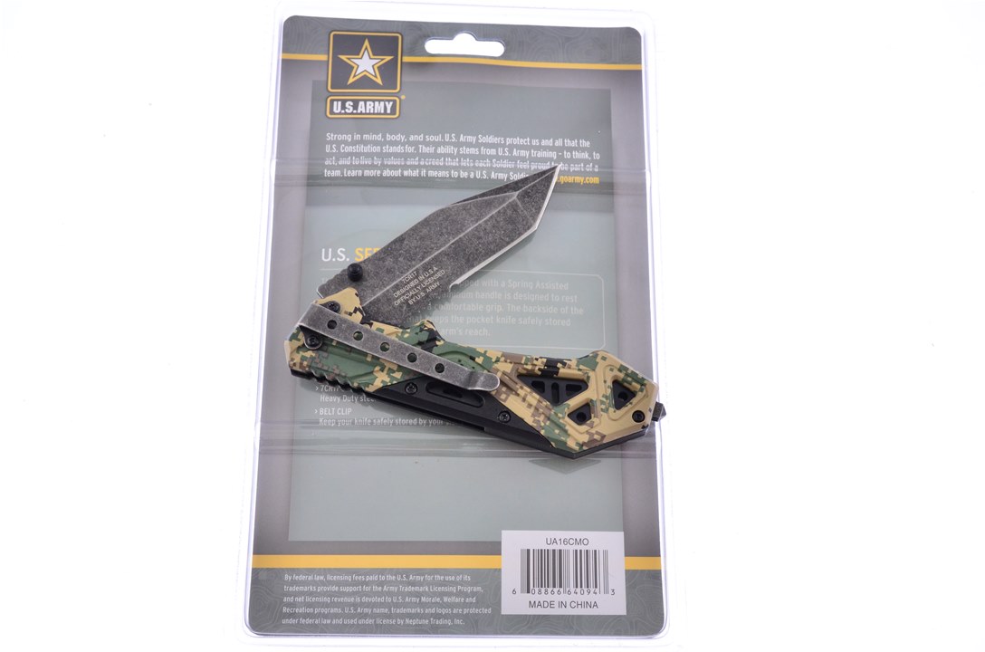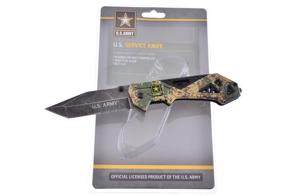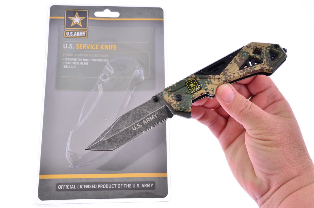 This U.S. Army Serive Knife is perfect for those service members in your life or to show support! It features a 7CR17 steel grade blade with a handle that rests seamlessly into your grip. The back of the handle features a belt clip allowing for easy storing but quick access when you need it. Get yours today before we run out!